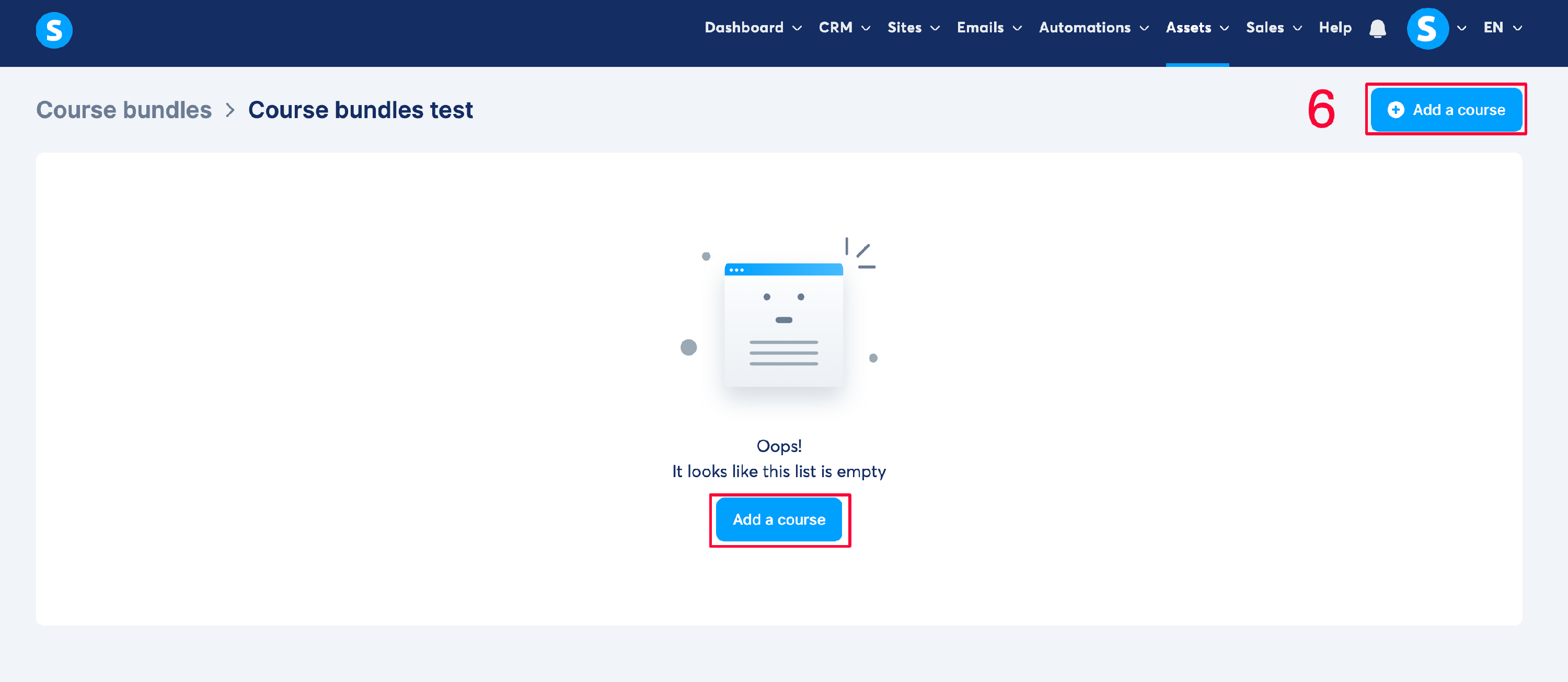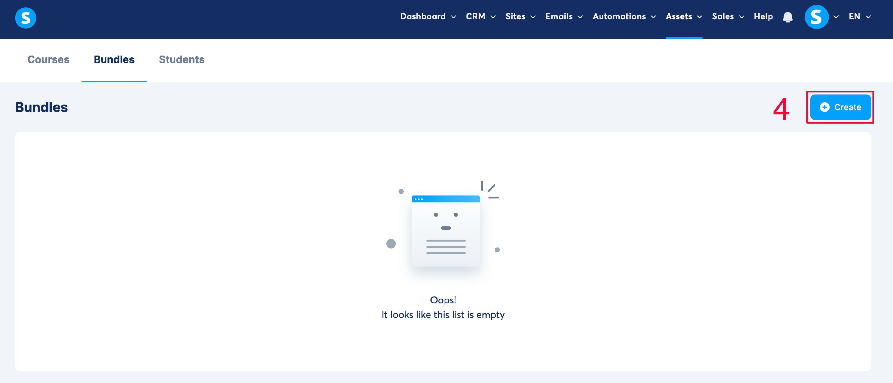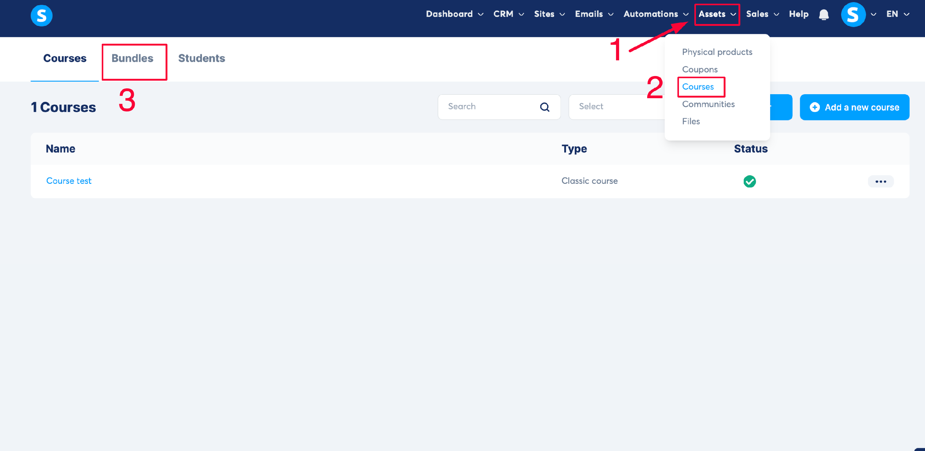 In the Menu, click on "Assets" (number 1 in the image), then on "Courses" (number 2 in the image), and finally on "Bundles". (number 3 in the image)