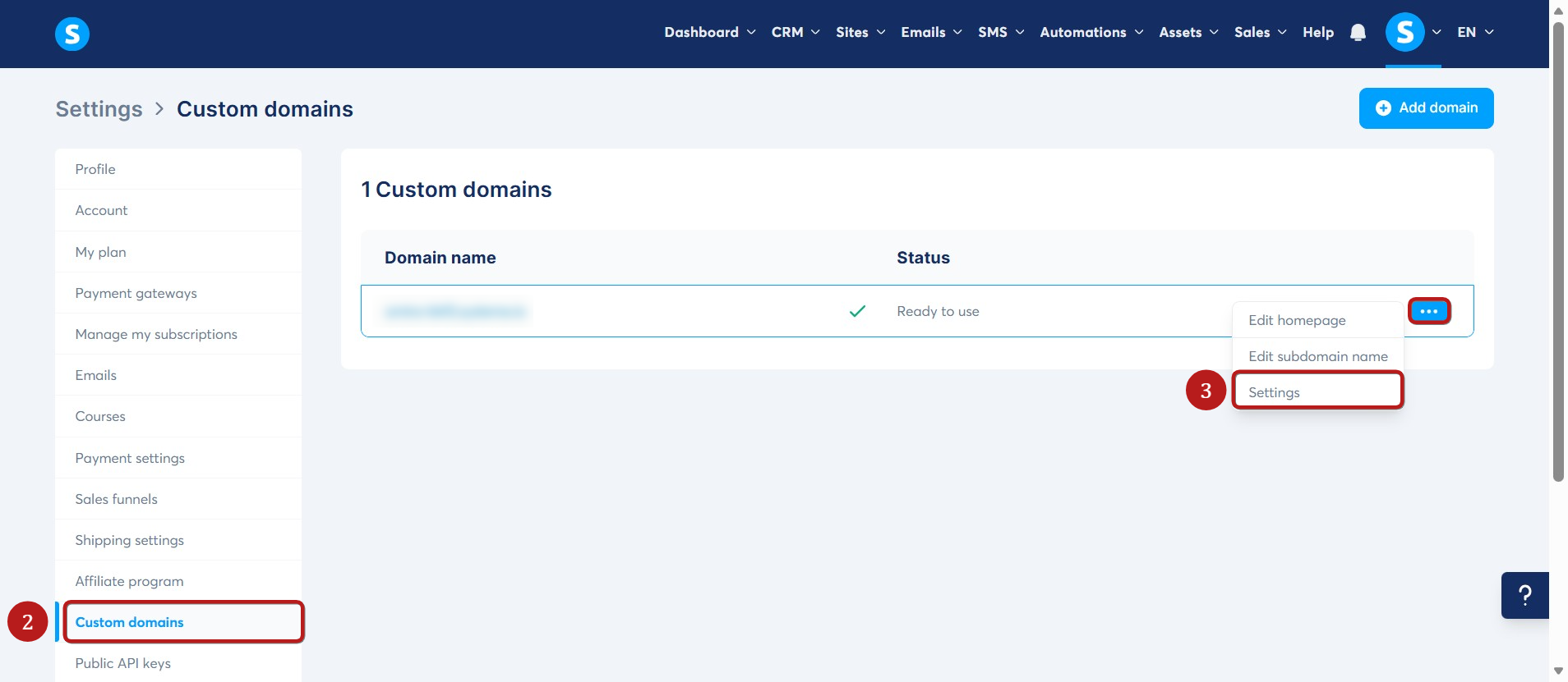 Next, click Custom domains (2). Then, click the three dots (...) and select Settings (3) to manage your domain settings.