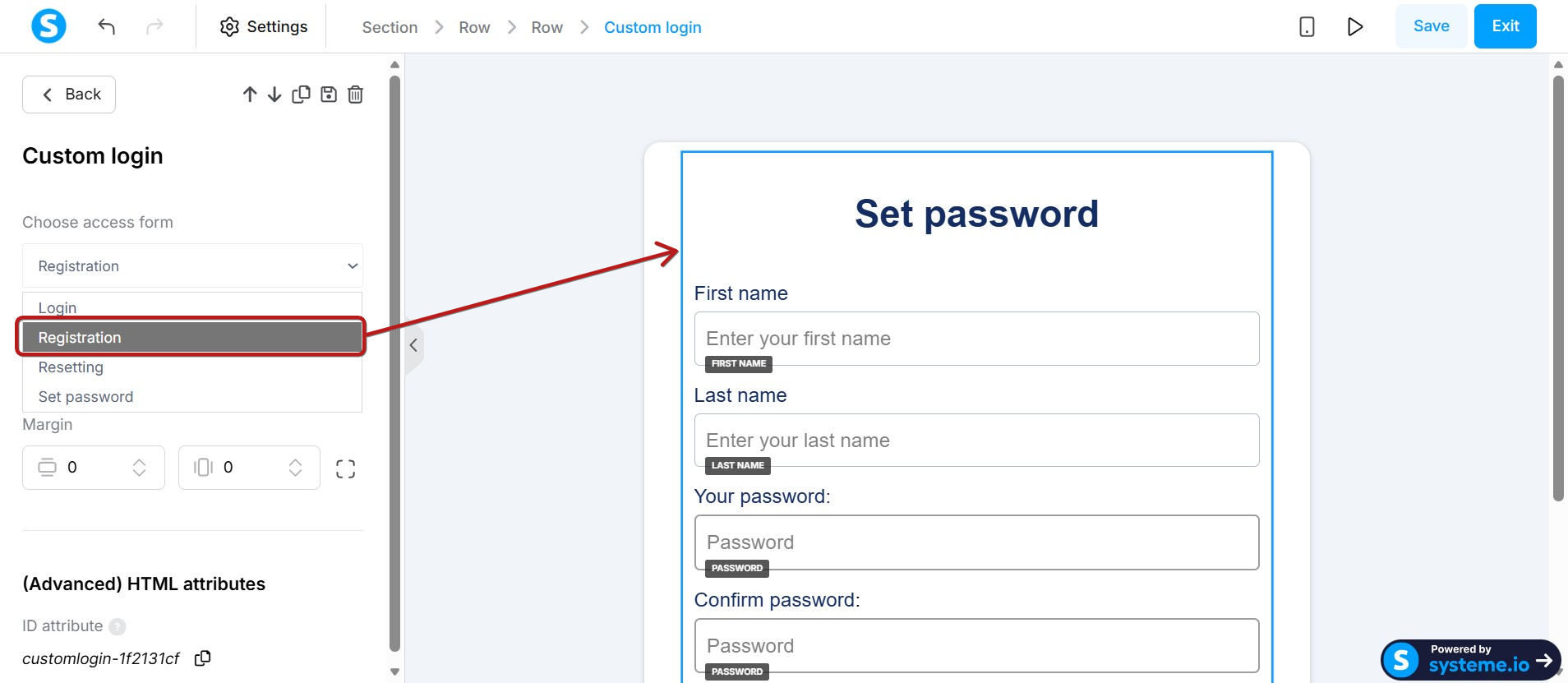 To modify the form, select Registration, then customize it using the available elements in the editor.