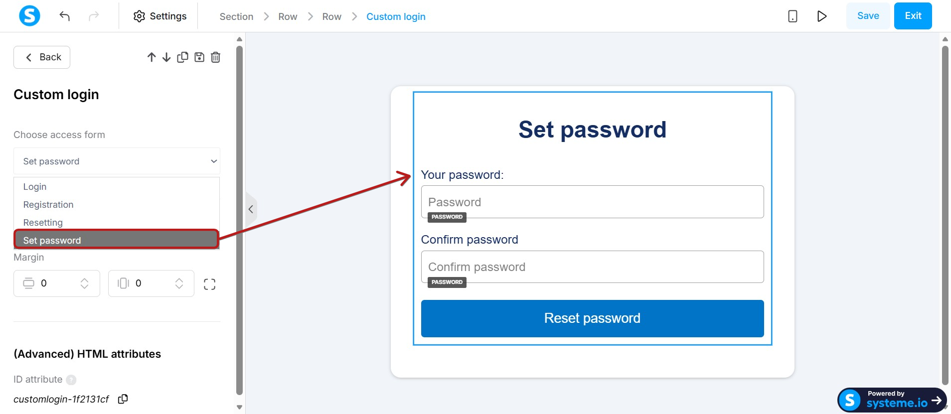 To modify the password setup form, select Set Password and edit it using the editor's elements.