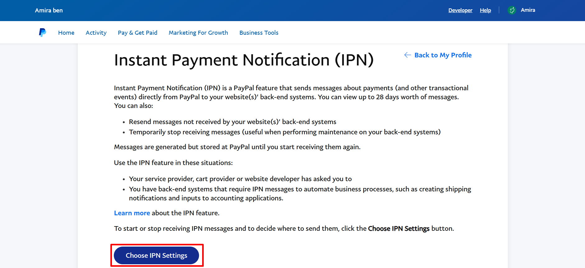 For the IPN Messages field, select the Receive IPN messages (Enabled) option.