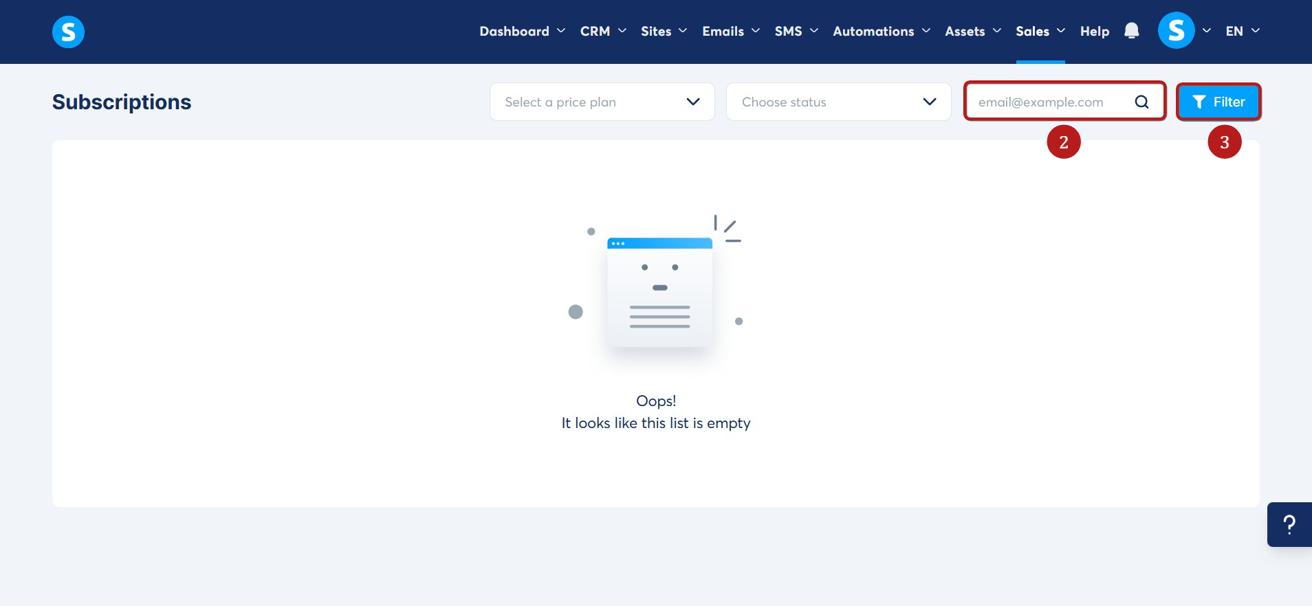 In the search field, enter the subscriber's email address (2), then click Filter (3).