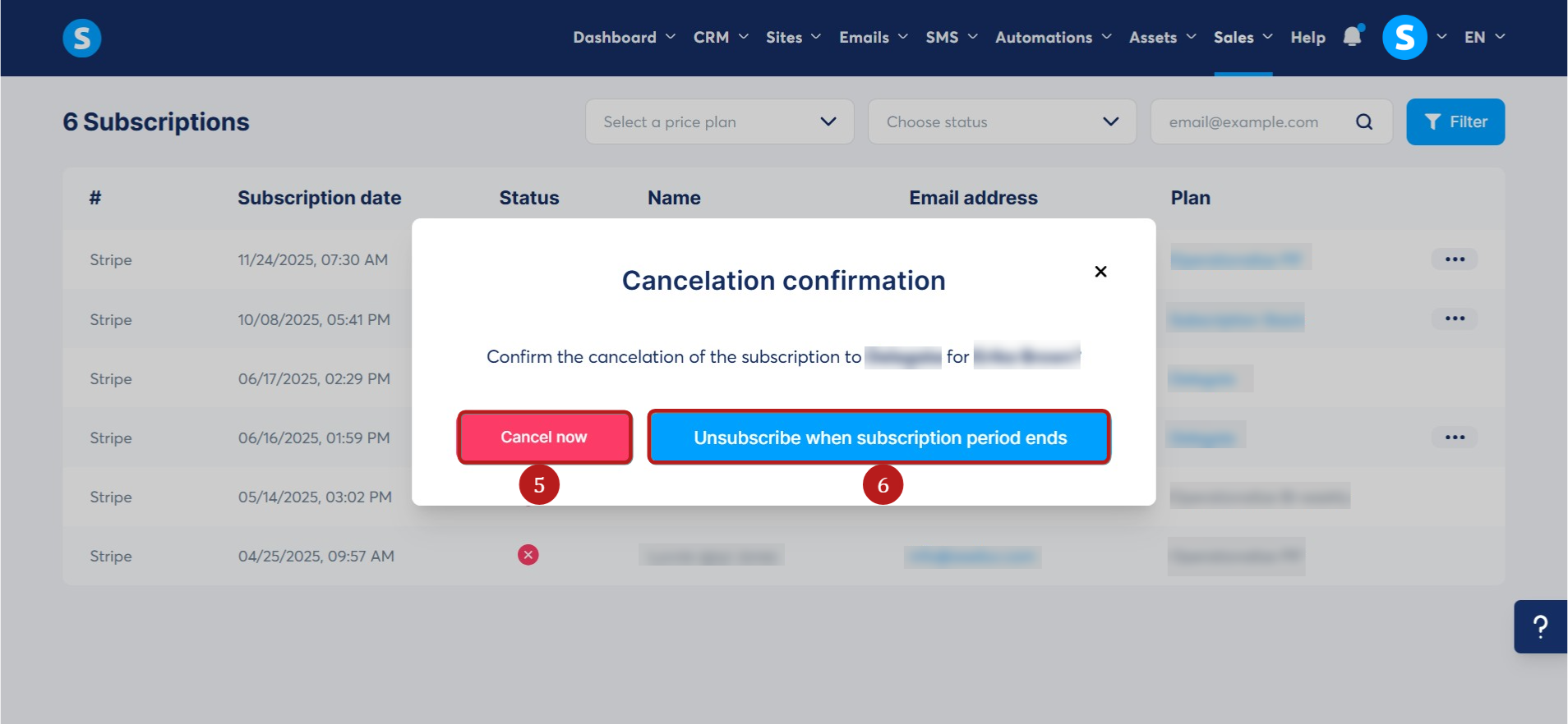 1) Unsubscribe when the subscription period ends: this option will cancel access to the resources listed on the payment page on the date the customer is scheduled to pay for their subscription (5).