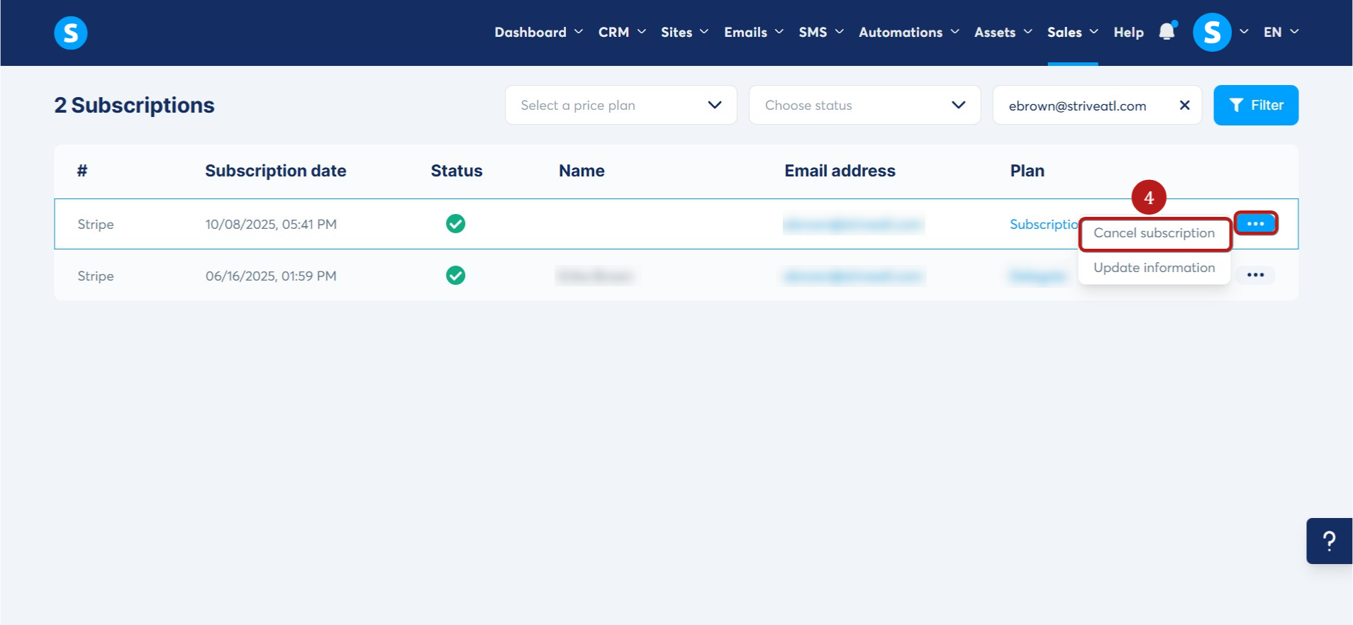 Finally, click the three dots next to the subscription you wish to end, then select Cancel subscription (4).