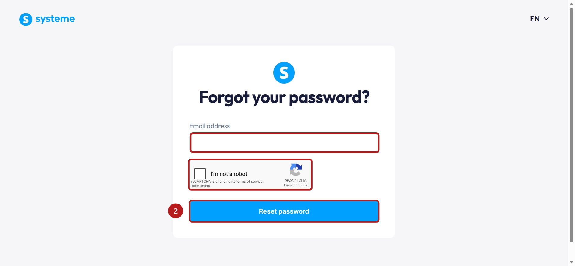 Next, enter the email address associated with your systeme.io account, check the reCAPTCHA, and click on Reset password (2).
