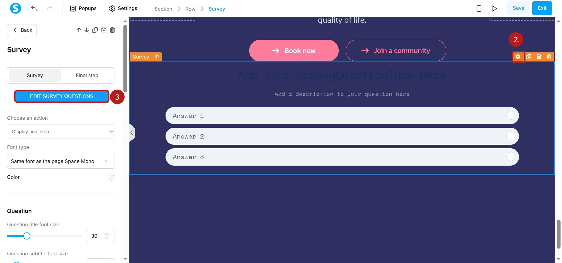 To edit the survey's questions, click the settings icon (2), then click on Edit survey questions (3).