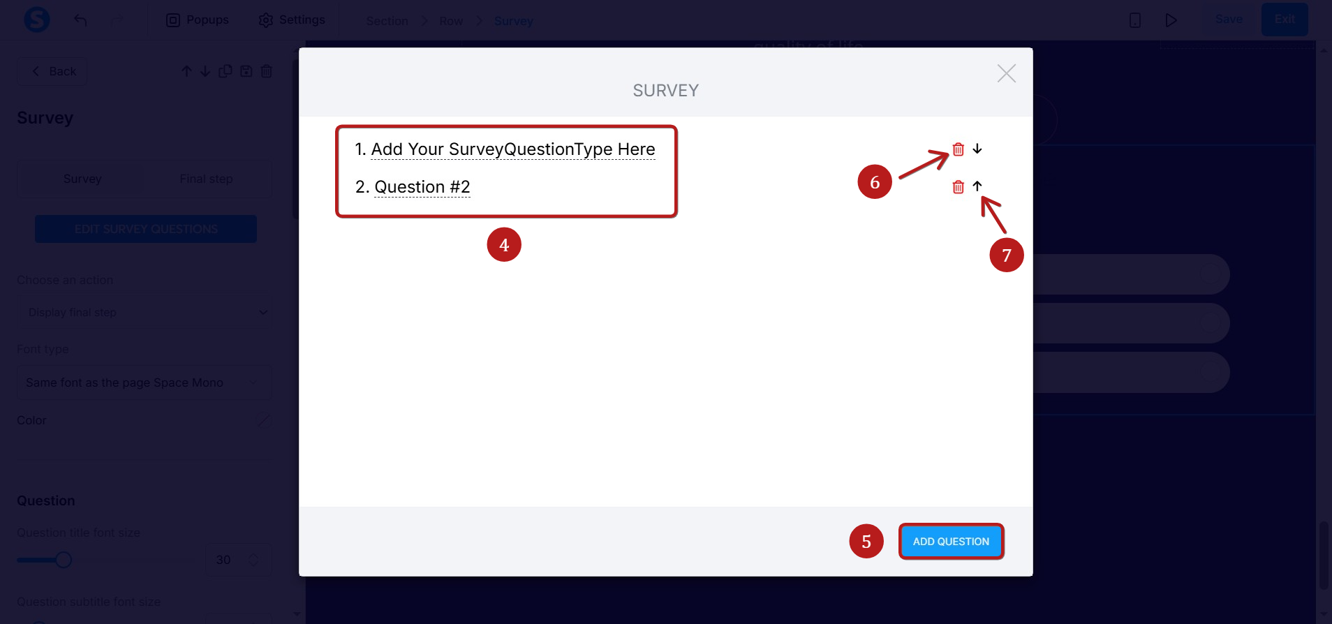 A popup will appear, allowing you to add, modify, delete, or reorder the survey's questions: