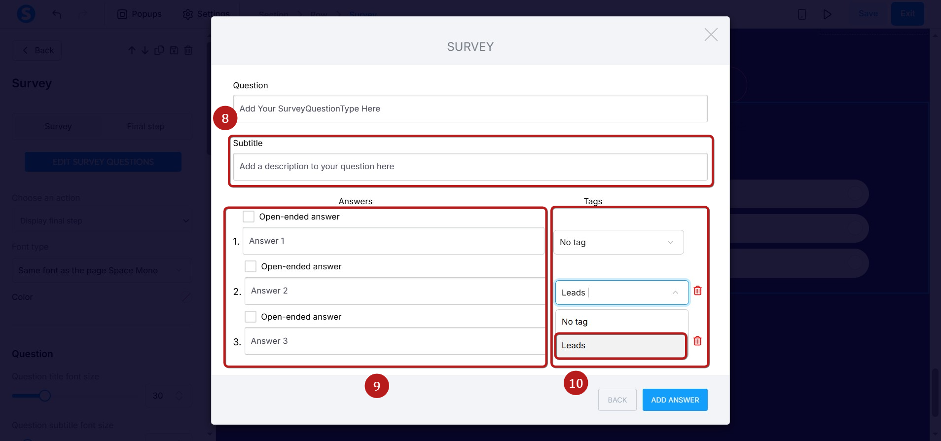- You can assign a specific tag to each answer to easily distinguish and identify the contacts who selected this answer. If you don't want to add a tag when a contact selects this answer, you can leave this field empty (10).