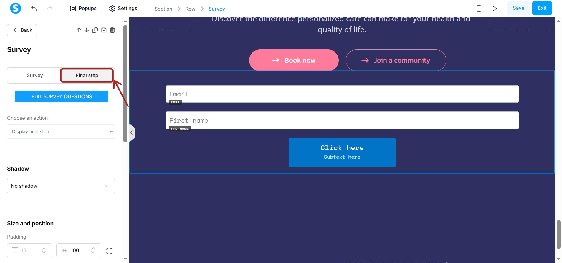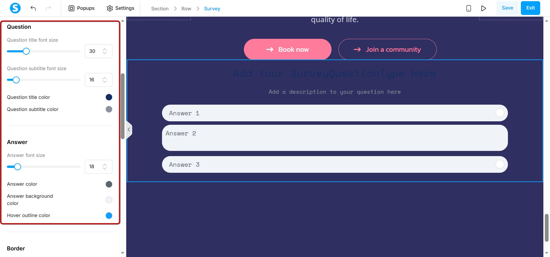 From the page editor, drag the Survey element (1) from the left panel and drop it onto your page.