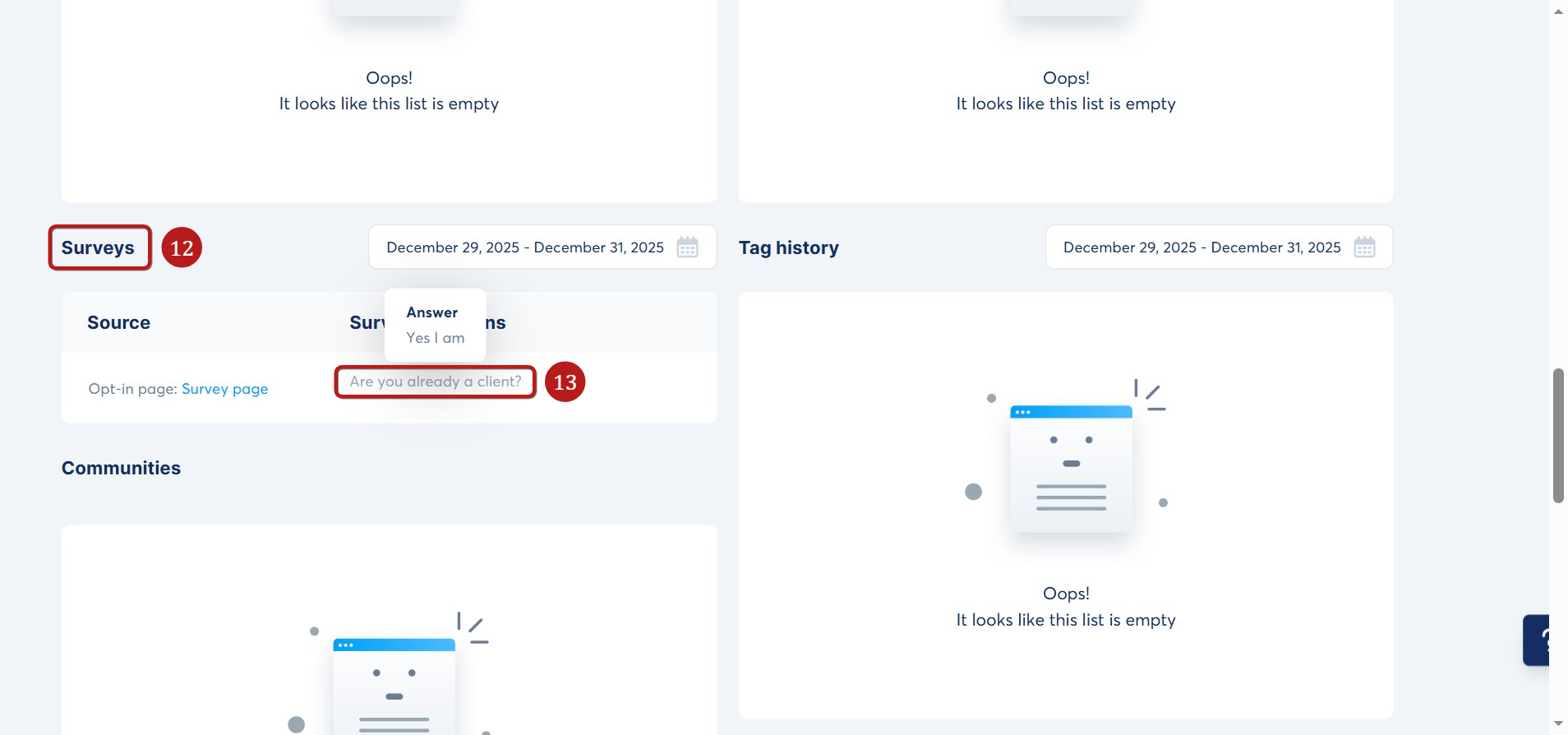 Contacts' answers can be found within their contact records. Scroll down to the Surveys section (12), then click on the question (13) to see the answer.