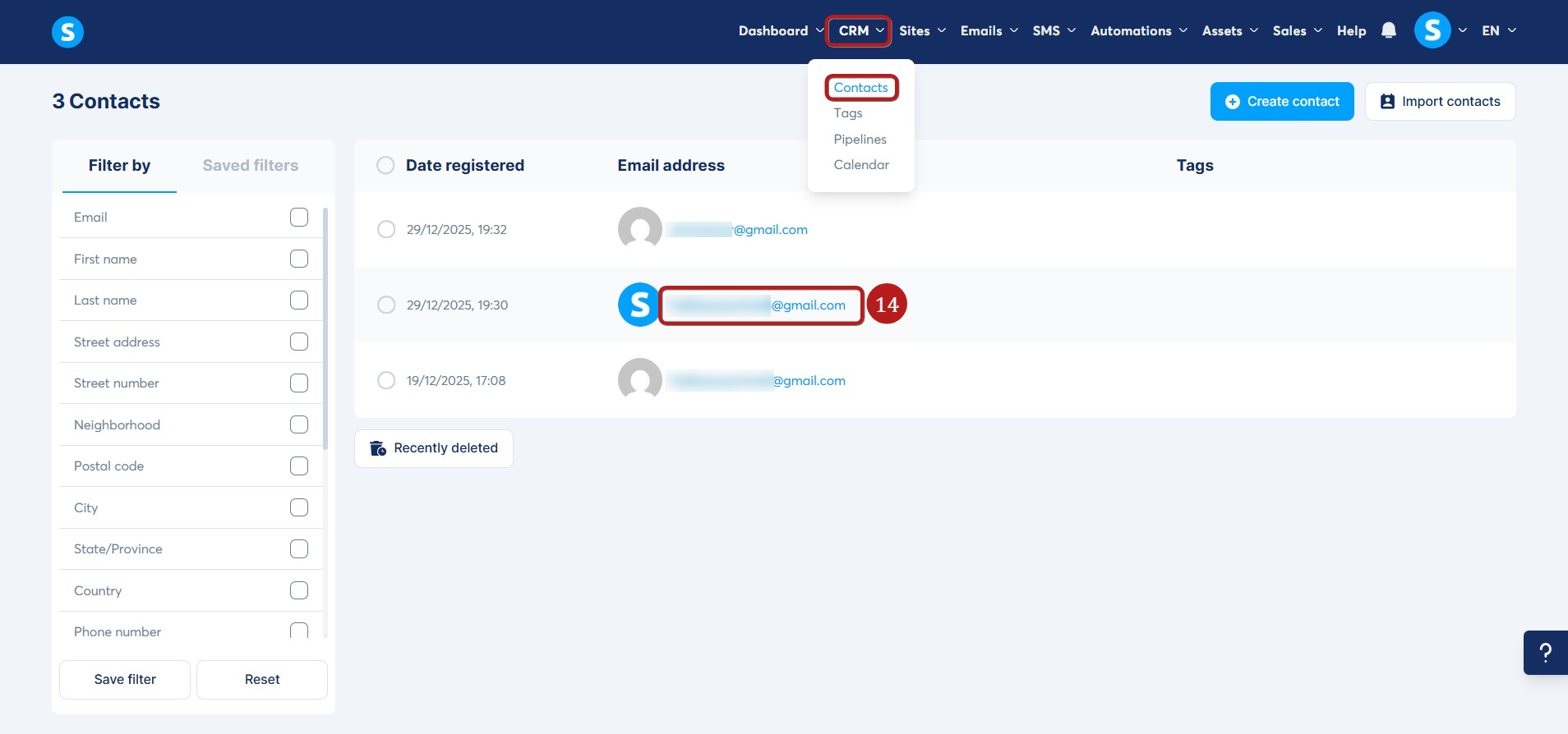 To access the contact record, navigate to CRM > Contacts, then click on the contact email address (14).