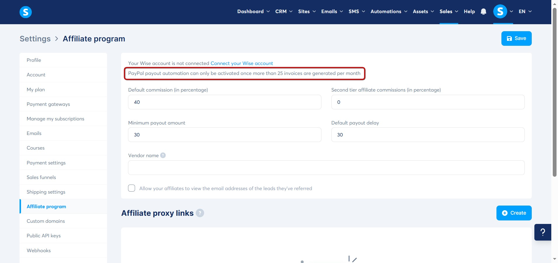 Once you have more than 25 affiliate invoices pending payment, connect your PayPal account to systeme.io to enable automatic payouts:
