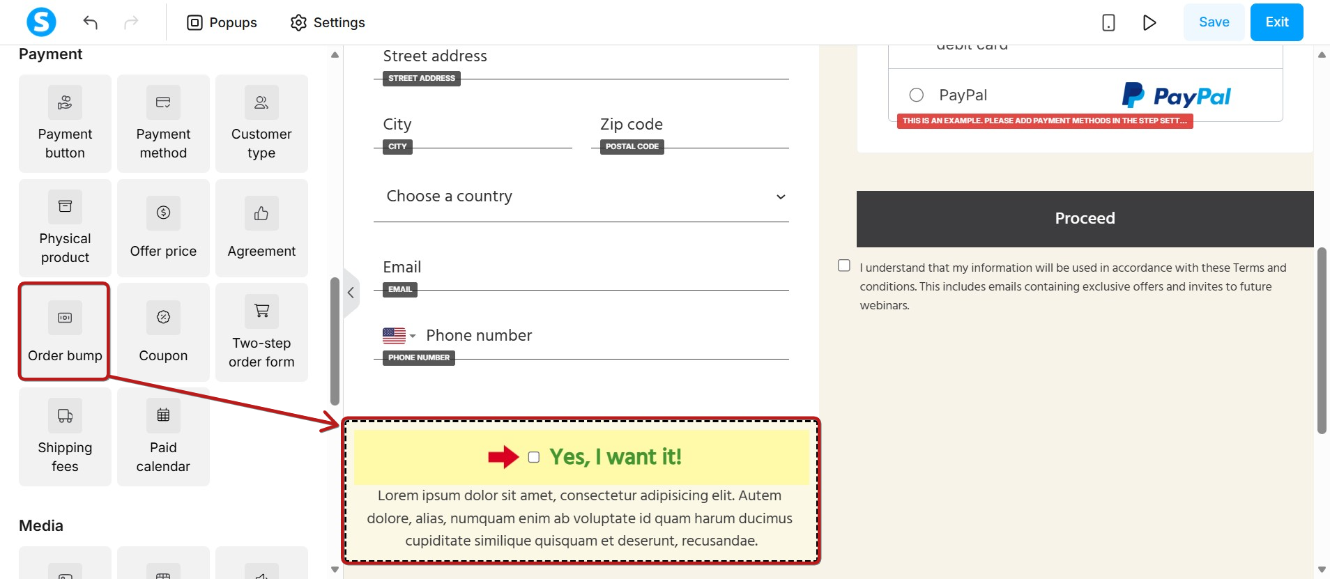 Once you've configured the order bump in your order form settings, access the page editor. Then, simply drag and drop the Order bump element into the page body to make it visible on your page.