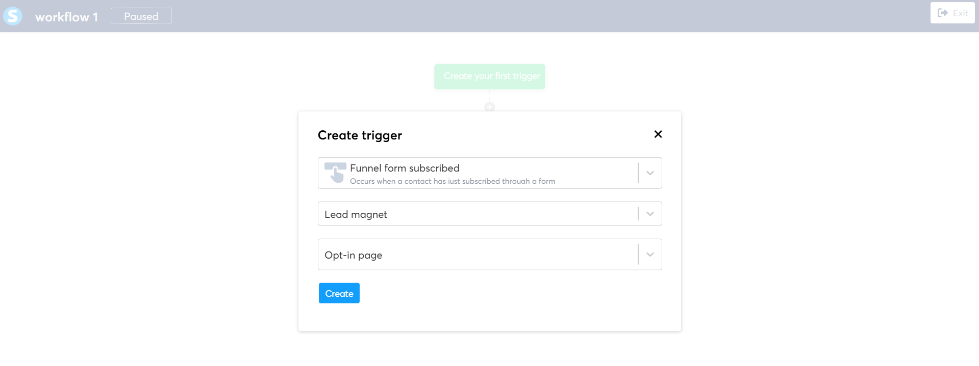 - Create a trigger: Choose “Funnel form subscribed” and select the opt-in page.