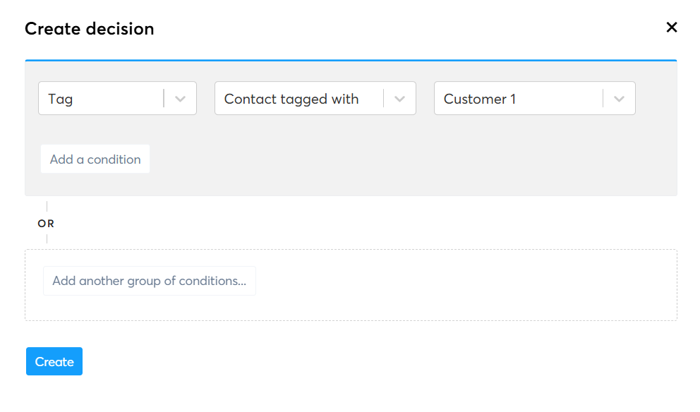 - Add a decision: Use the “Tag” filter → “Contact tagged with” → choose “Customer 1”.