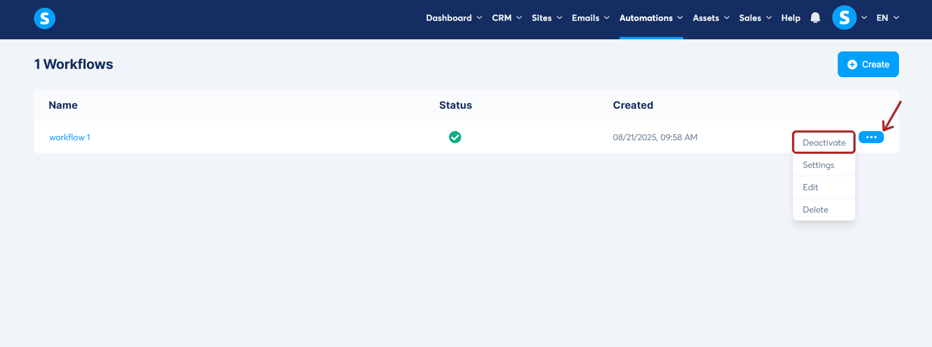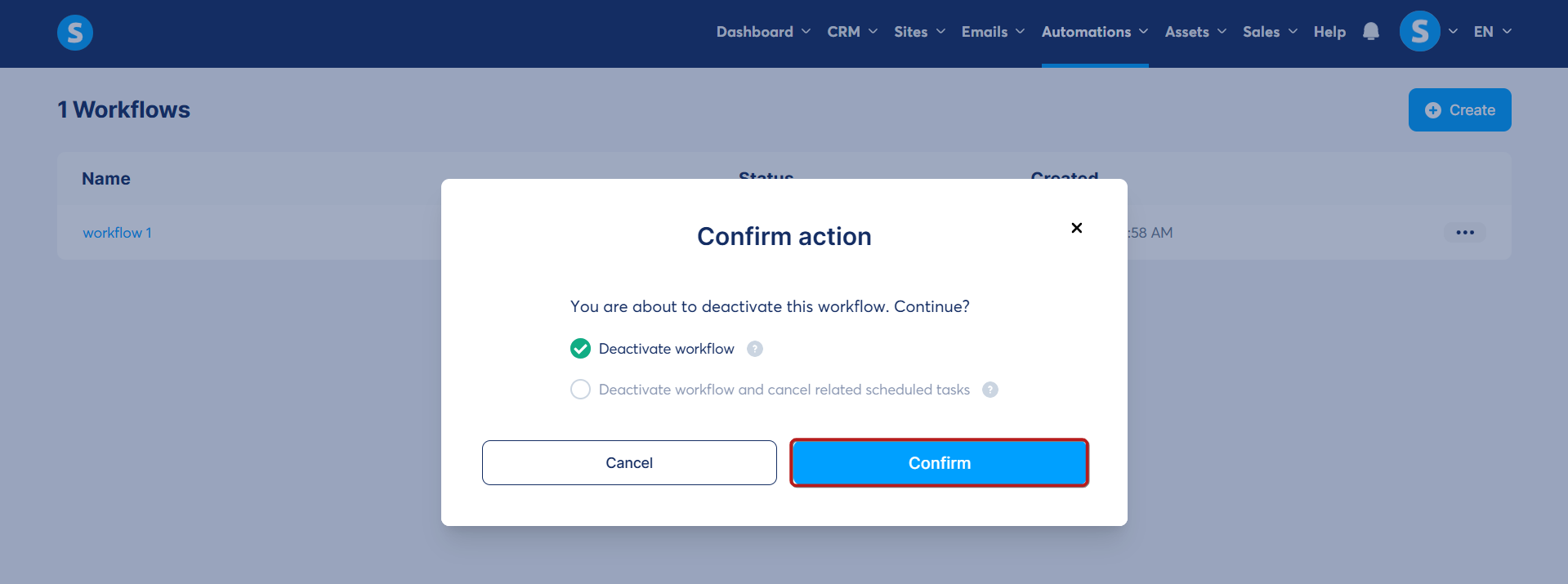 - Deactivate workflow: Stops new contacts from entering, but existing scheduled tasks will continue.