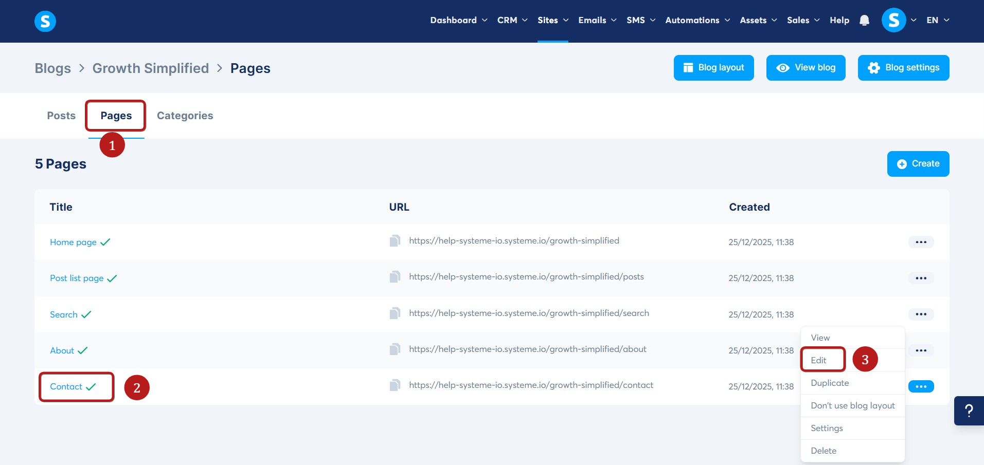- Click the three dots on the right to edit the page (3).