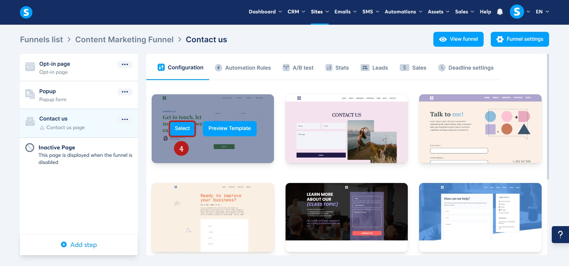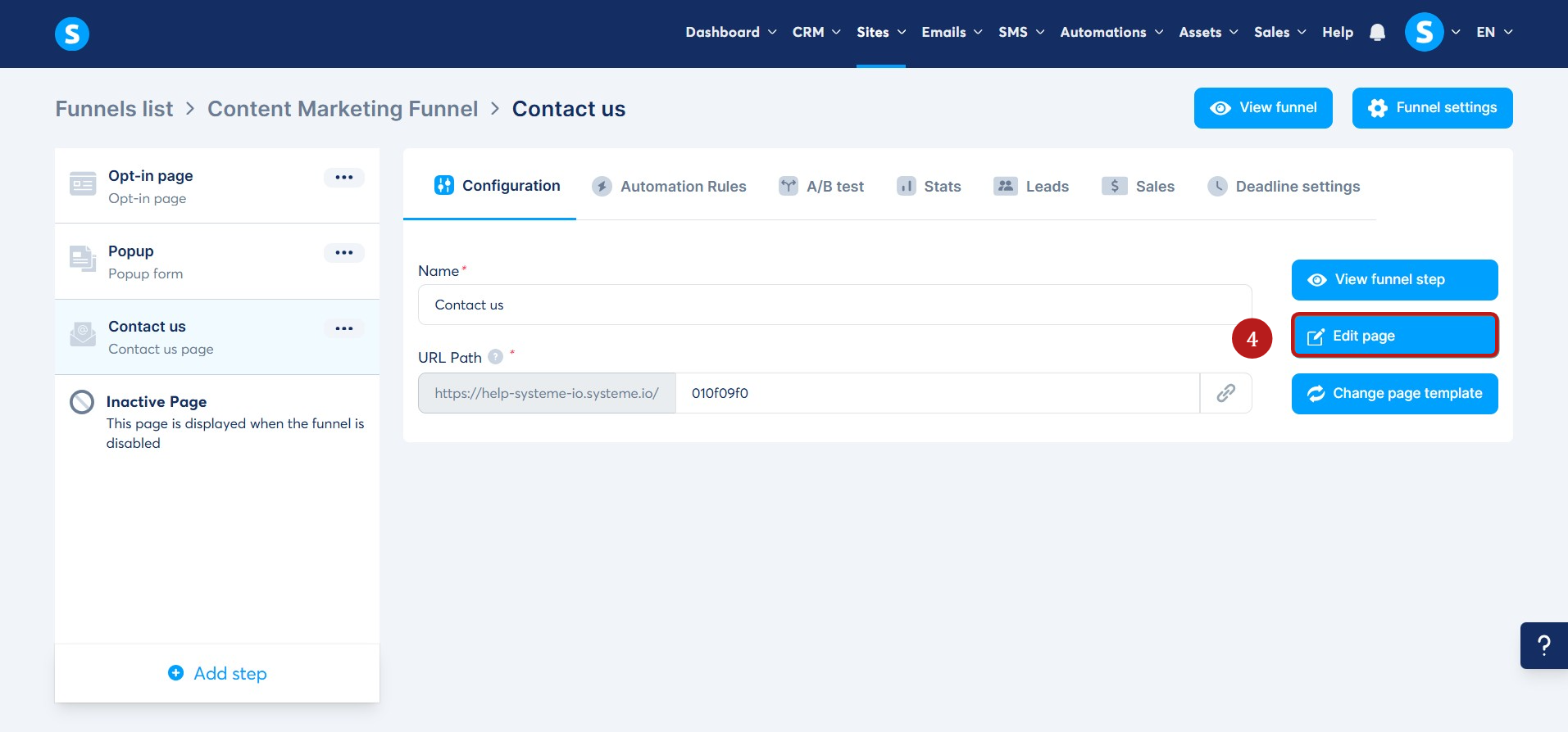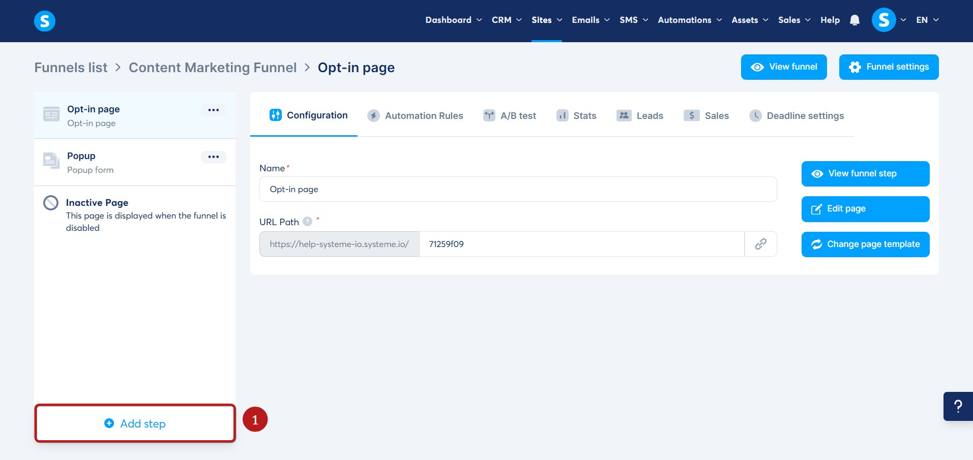 - Create a new sales funnel step by clicking on Add step (1).