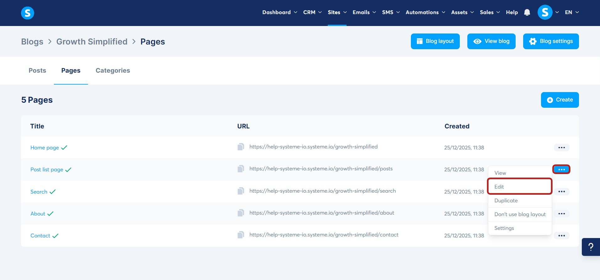 To do this, click the three-dot menu on the right to open the editor for the desired blog page.