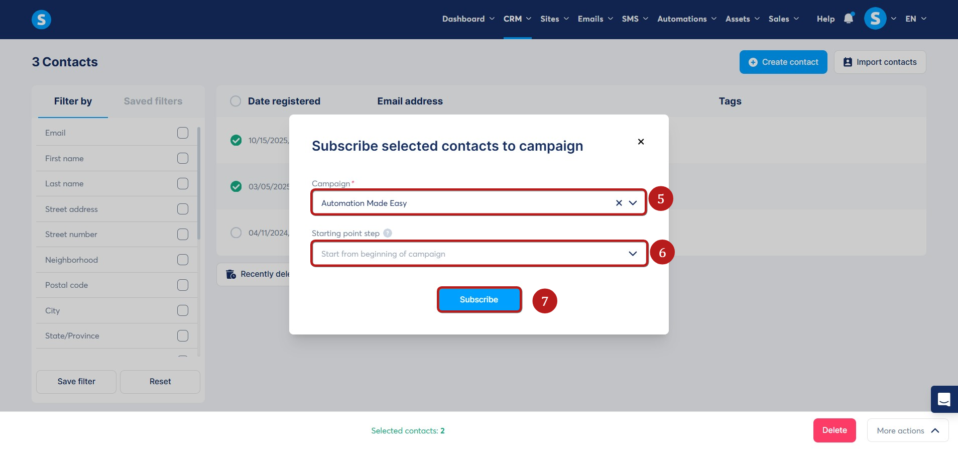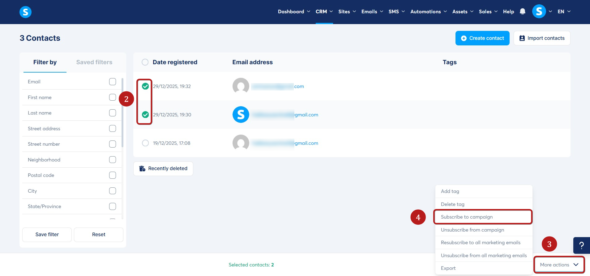 Select the contacts you want to subscribe by checking the box next to their email addresses (2).