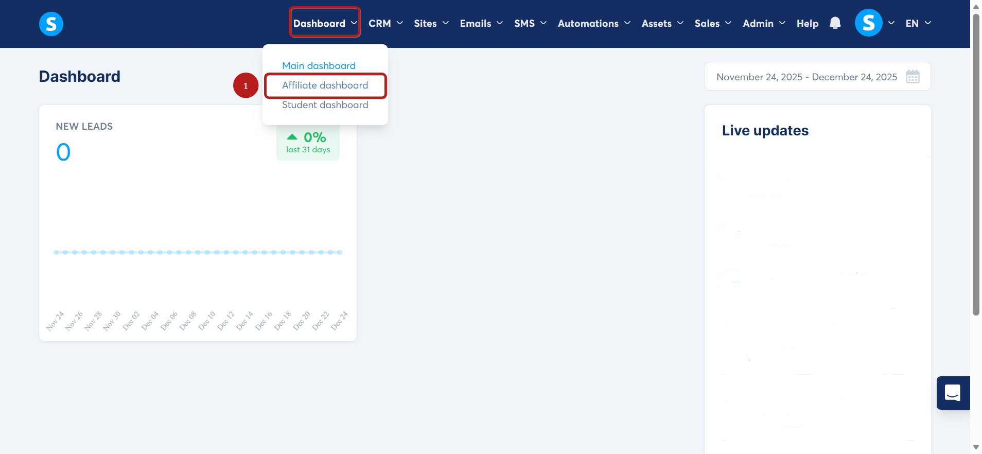 To find your affiliate ID and your various affiliation links, go to Dashboard, then Affiliate Dashboard (1)(number 1 in the image)