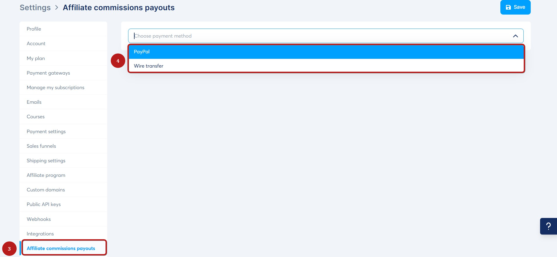 To do this, please access the Settings section from your profile picture, then select Affiliate Commissions Payouts (3). Then, to receive your commissions, please choose a commission payment method, either via PayPal or by bank transfer to your account (4).
