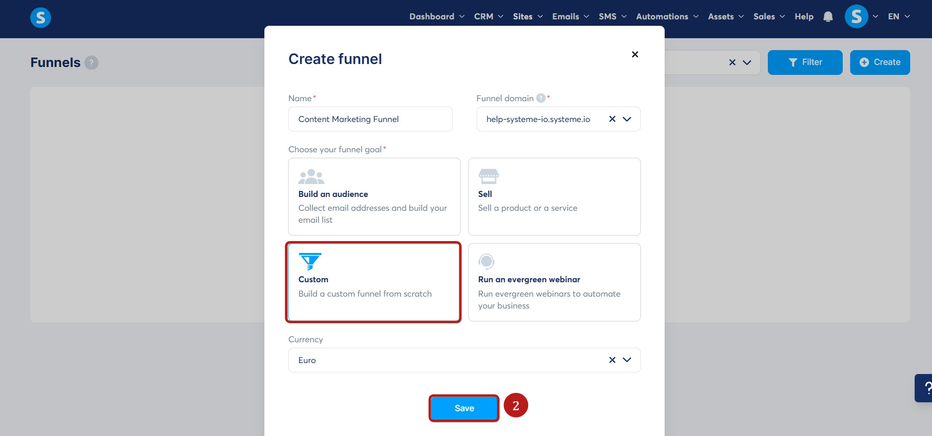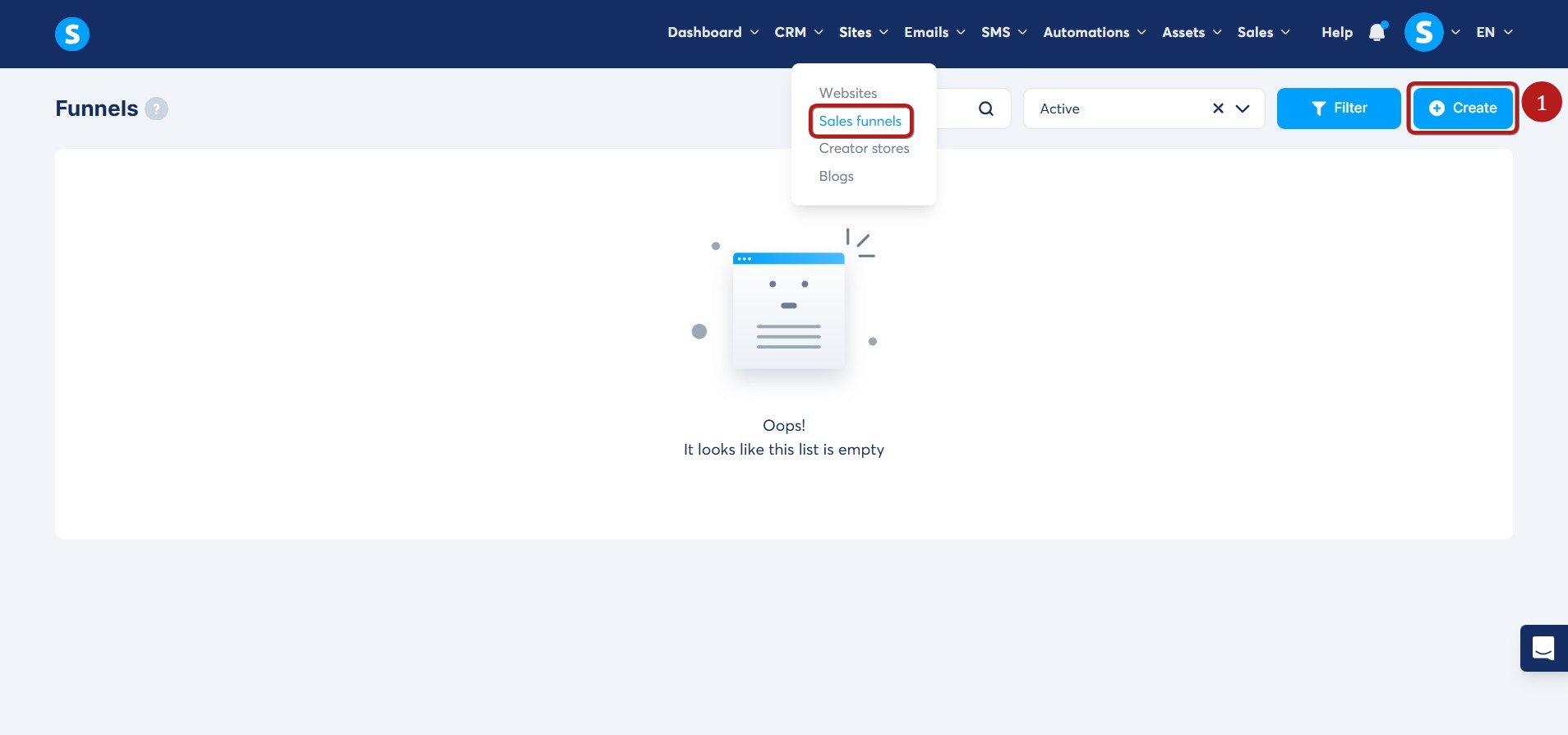 Go to the Sales Funnels tab and click on Create (1) to set up a new sales funnel.