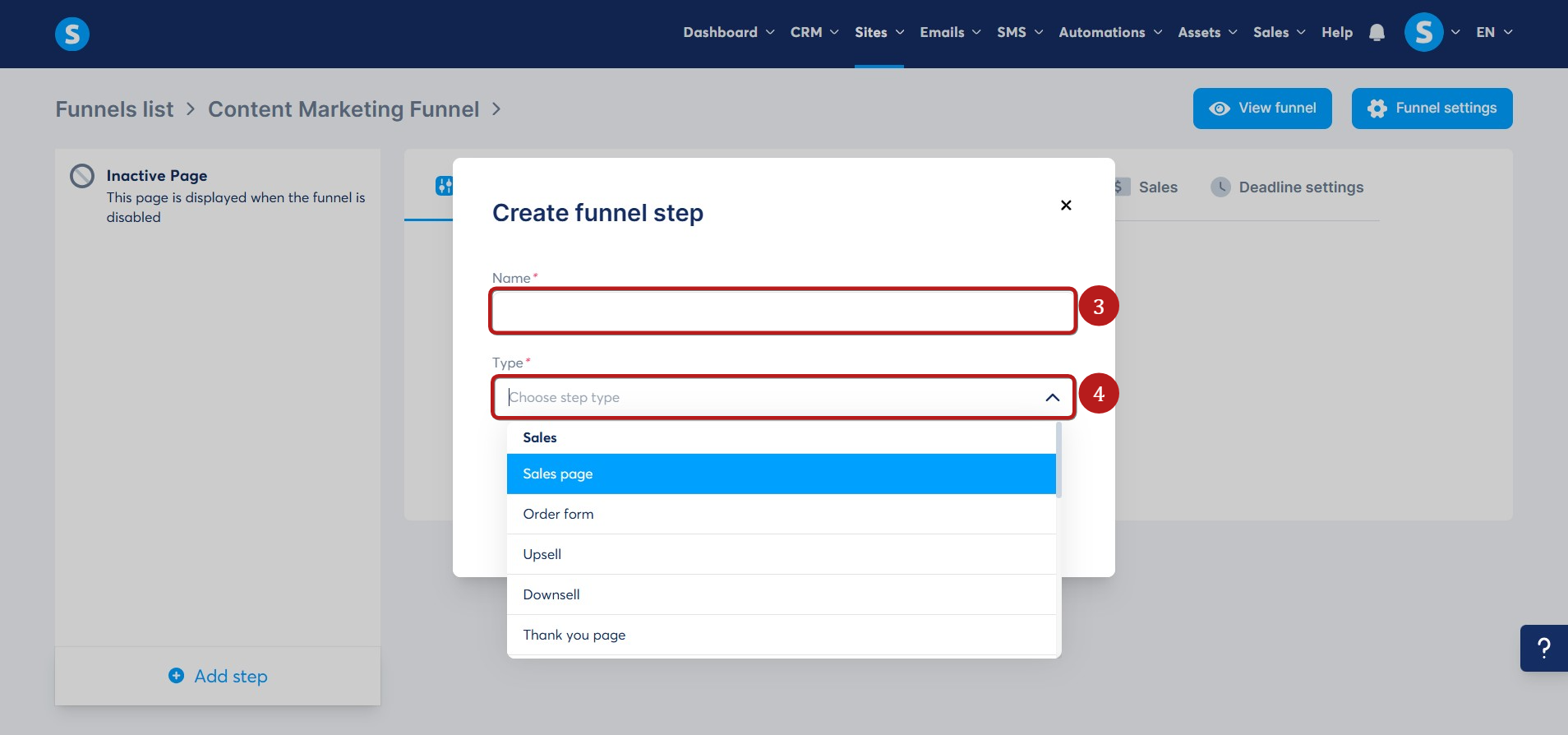 A popup will appear where you need to enter a name for your page (3) and select the page type (4).
