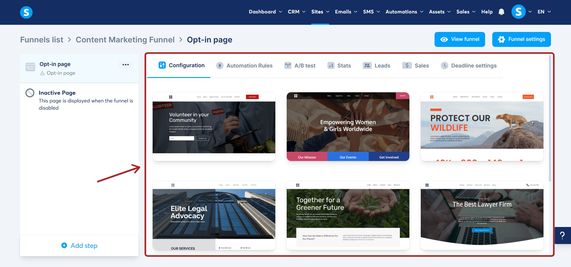 After filling out the popup and saving, you will have the option to select a template from the designs offered by systeme.io and customize it as you wish.