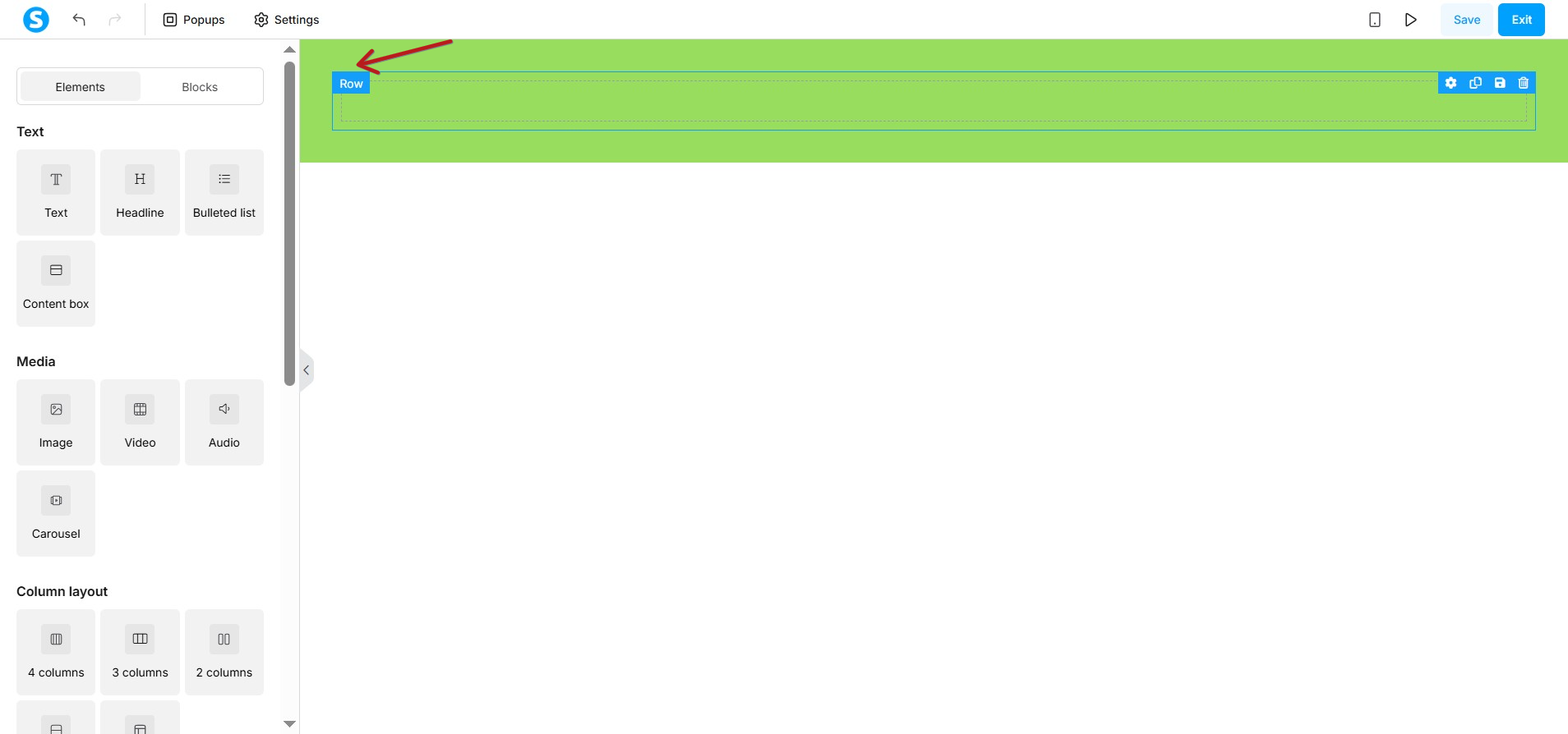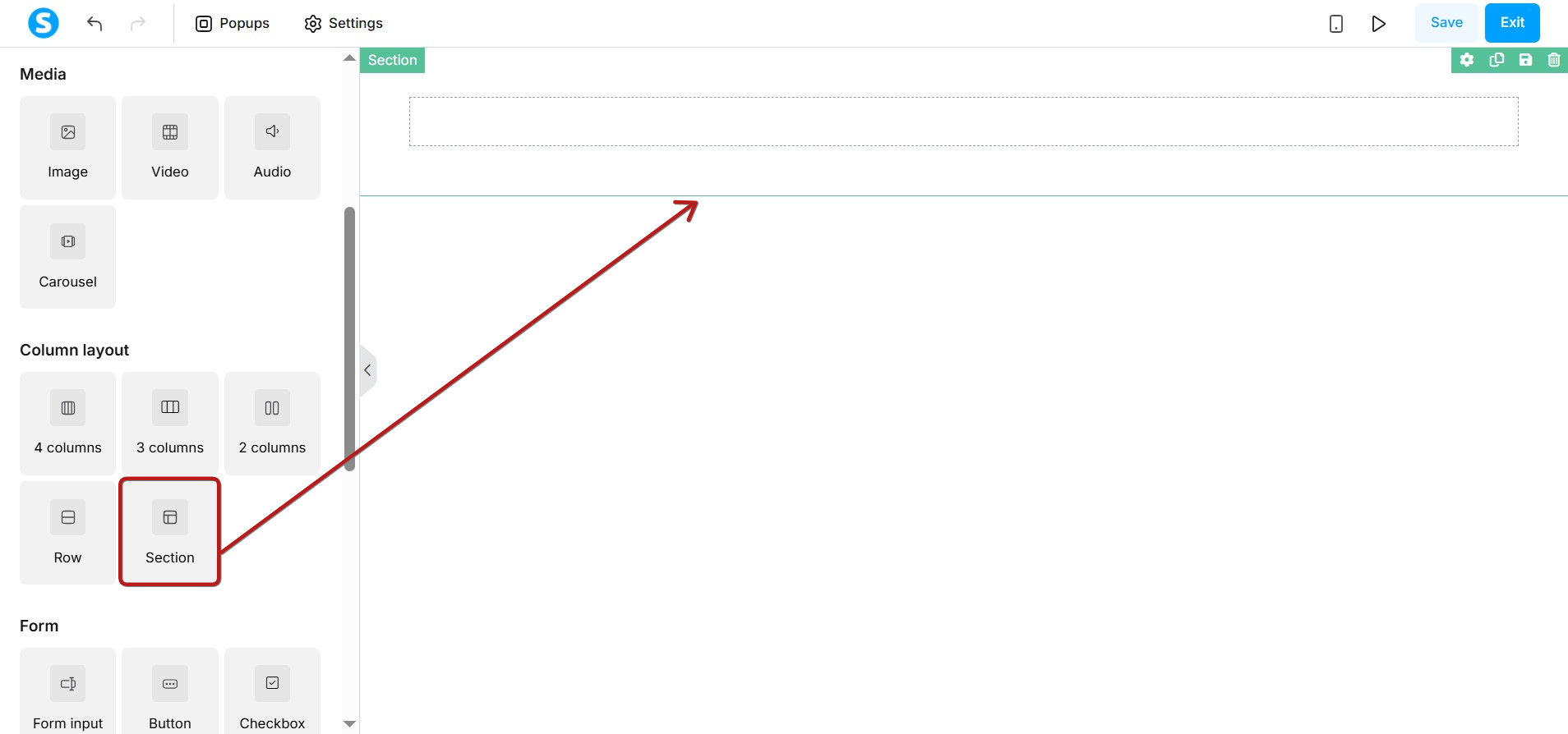 - Drag the Section element from the toolbar.