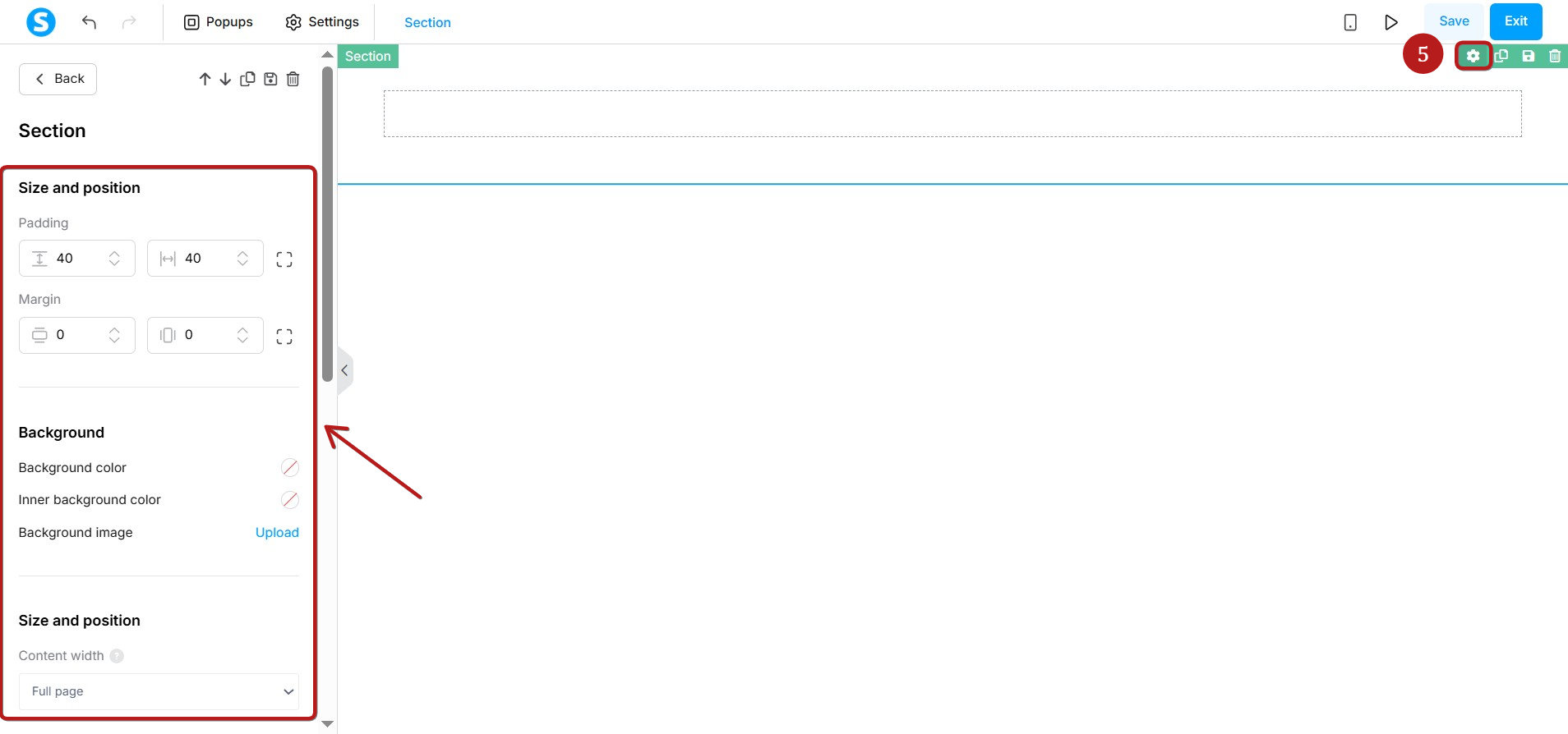 - Click the settings icon (5) to edit the section.