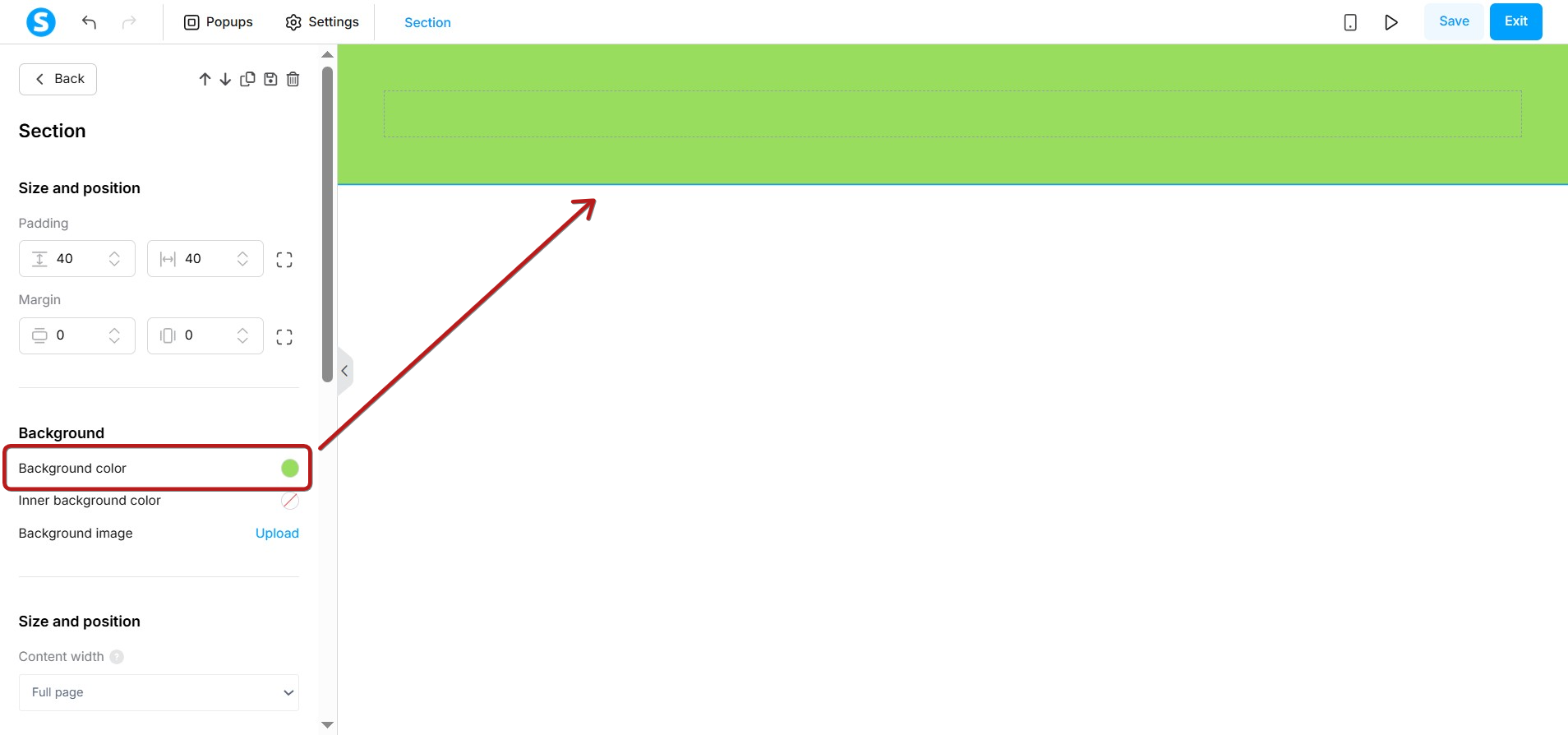 - Change the Inner background color of the section.