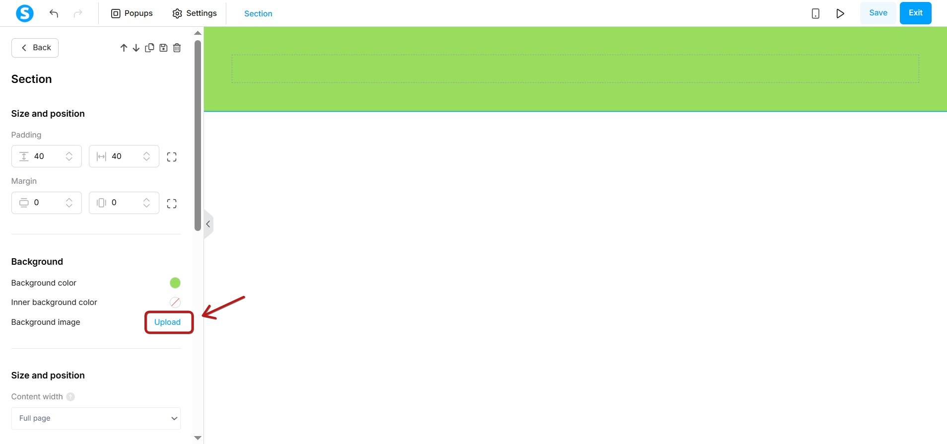 - Upload a background image by clicking on Upload.