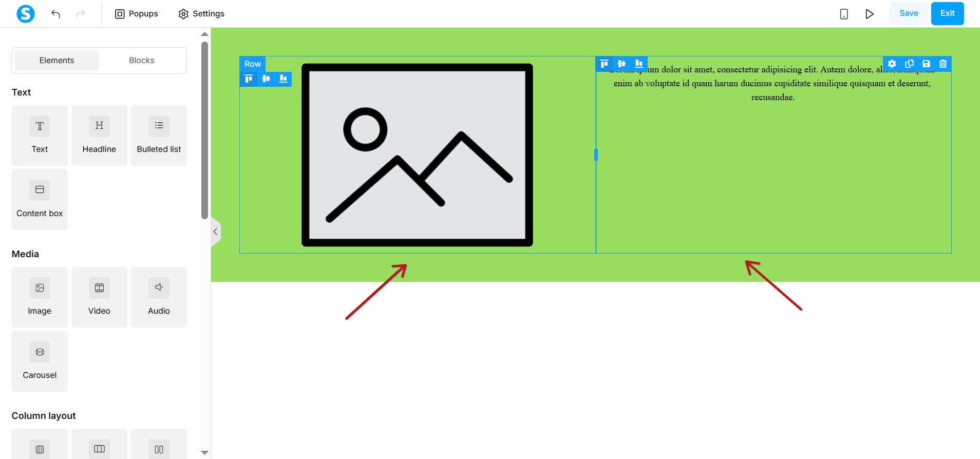 - Add columns by dragging the Column element inside the sections.