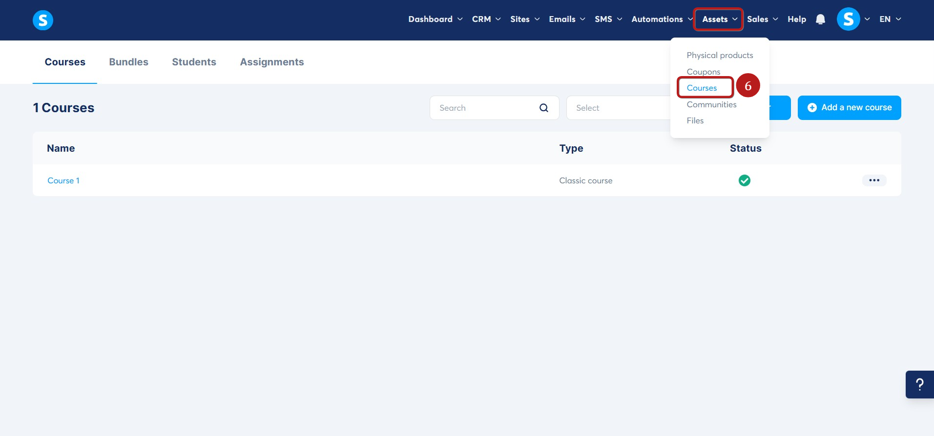 Navigate to the Assets tab and select Courses (1). Click Add a new course to create a new one (2).