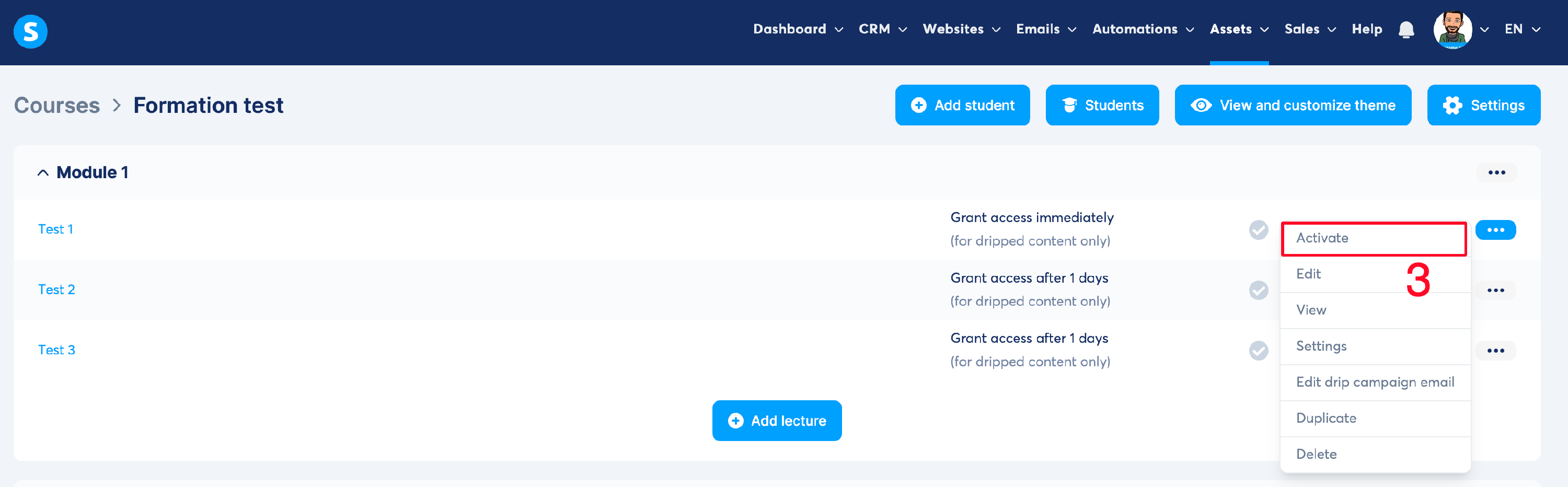 To publish a lecture, hover over the 3 dots (...) and click on "Activate" (number 3 in the image).