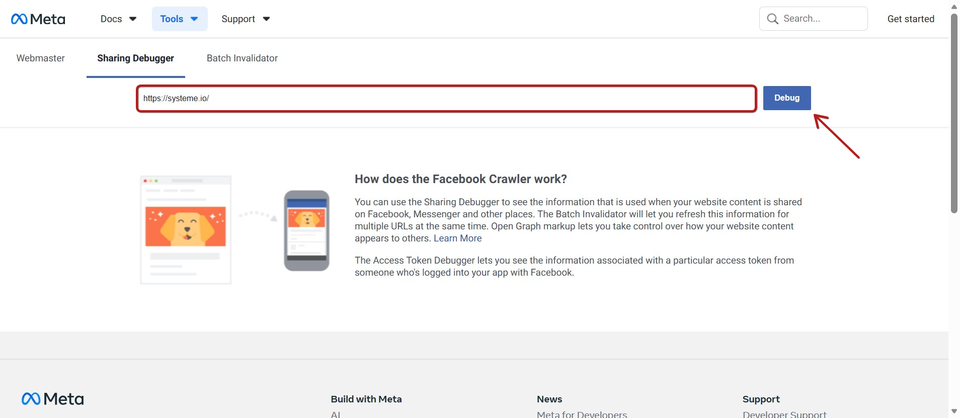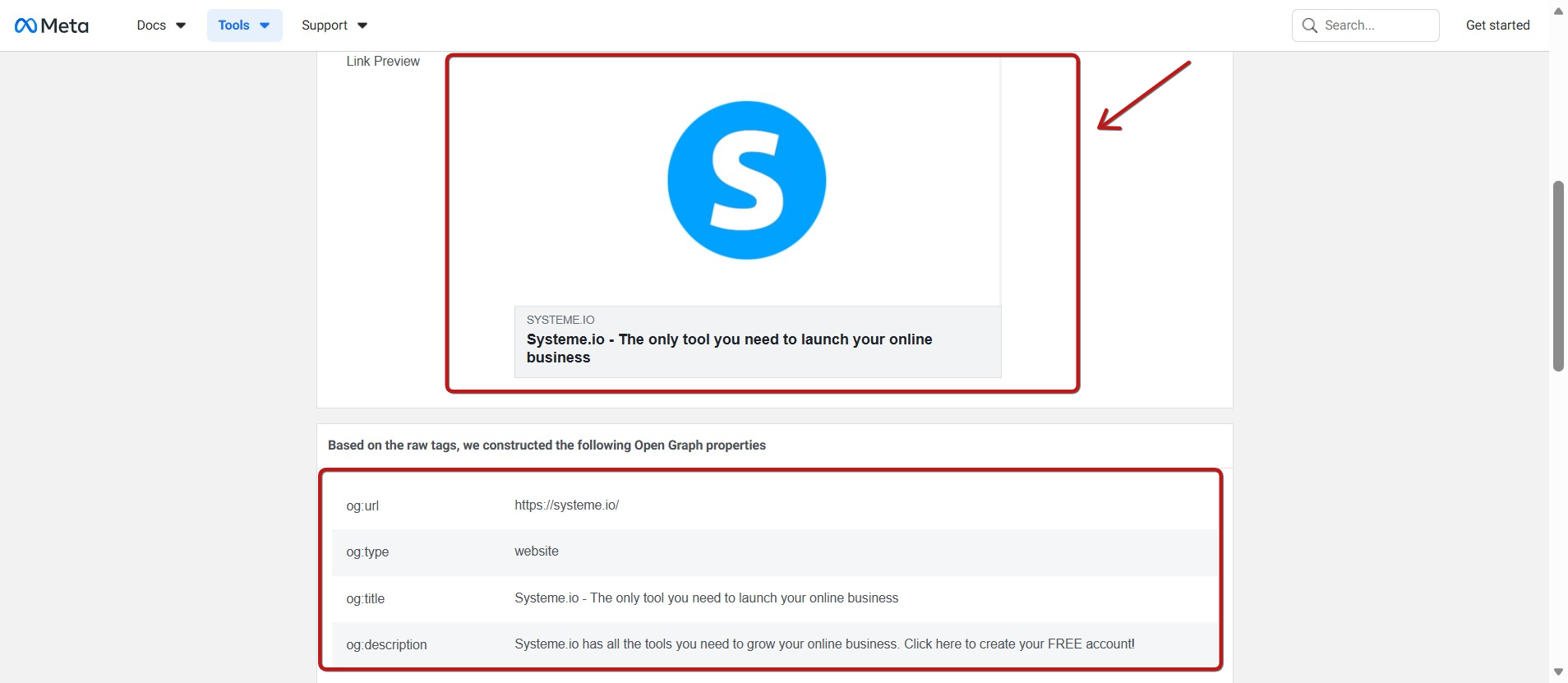 Let's take the example of the page "https://systeme.io/" and the Facebook debug link below: