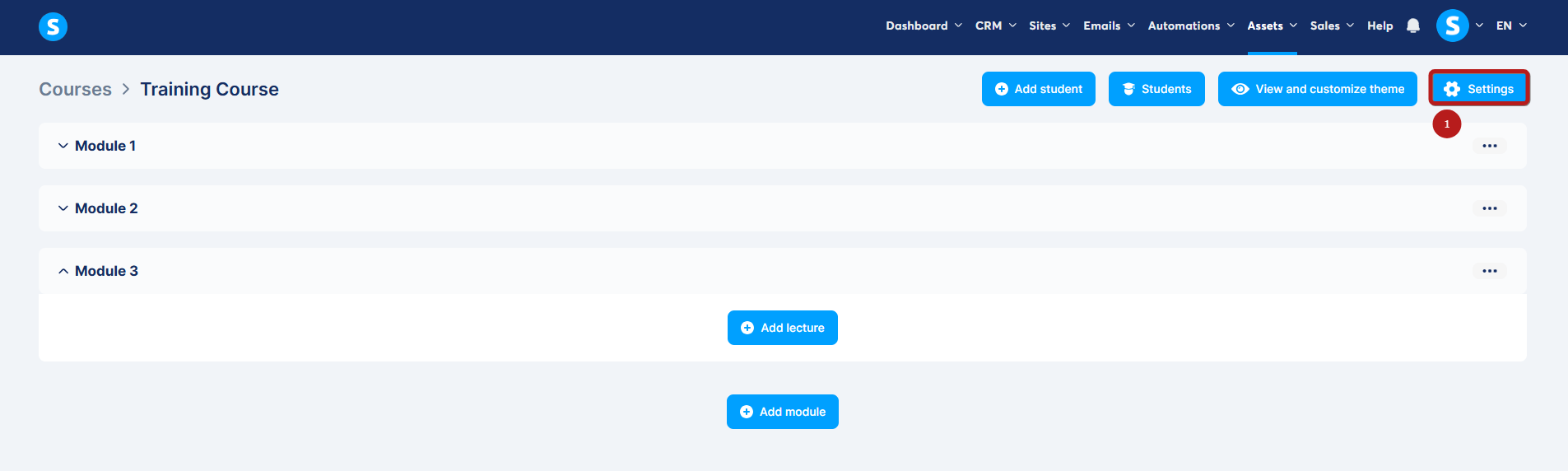 1. Go to the settings for the course you want to display on the students' dashboard (1).