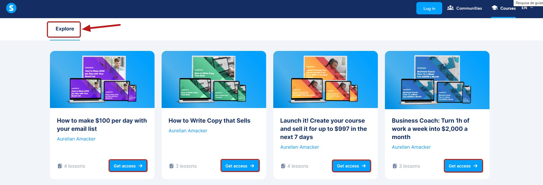 Once you've configured these options, your course will automatically be added to the Explore courses tab in the student dashboard. When they click on Get access, they will be taken to the funnel and funnel step defined in the previous configuration to complete the purchase.
