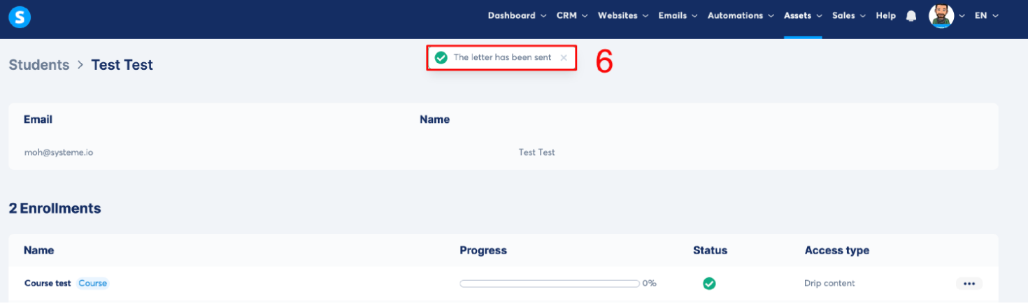 Once you are on the student's profile, go to the "Enrollments" section, click on the 3-dots icon and then on "Resend the access email" to resend the access email (number 5 in the image).