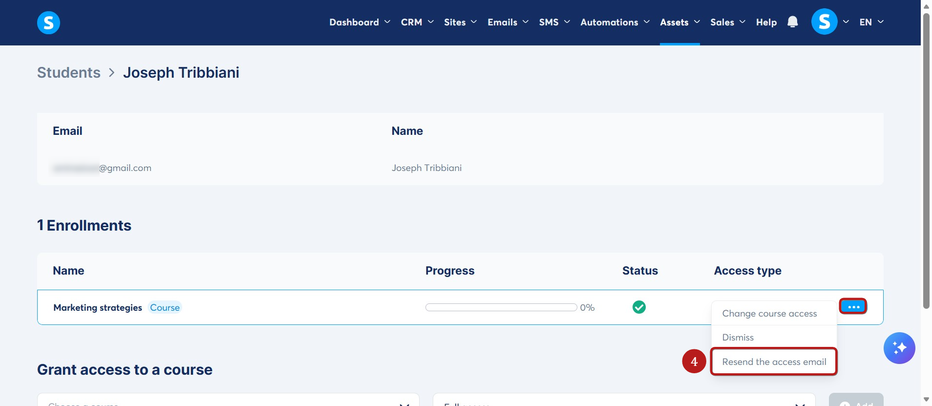 Once you are on the student's profile, go to the Enrollments section, click on the three dots, and then on Resend the access email (4) to resend the access email.