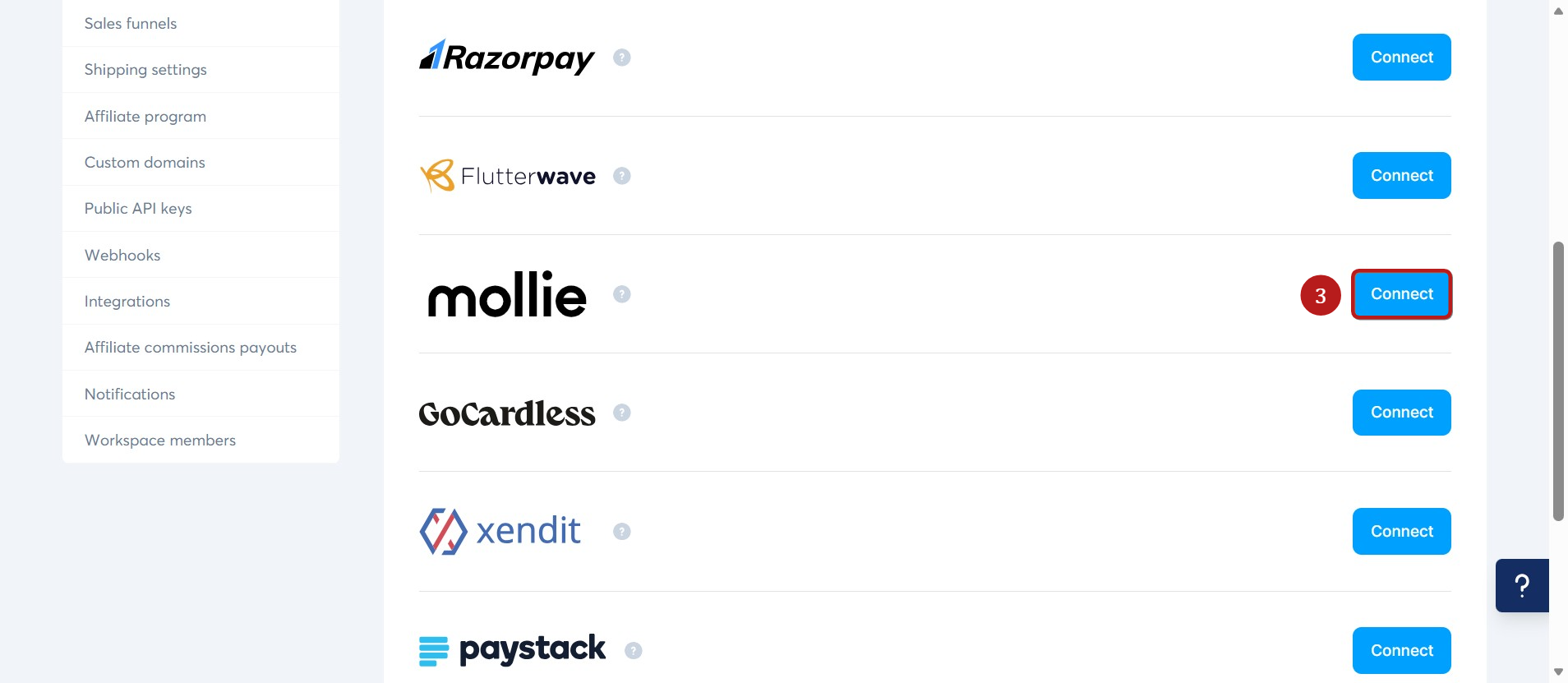 On the payment gateways page, click Connect (3) next to Mollie.