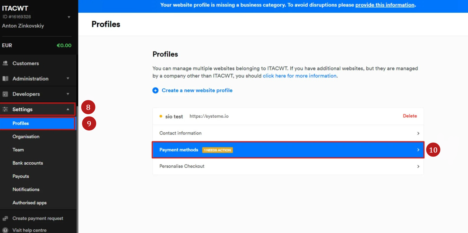 To configure payment methods for your profile, go to the Mollie dashboard. Click Settings (8), select the Profiles tab (9), and then choose Payment methods to select the options you want to accept (10).