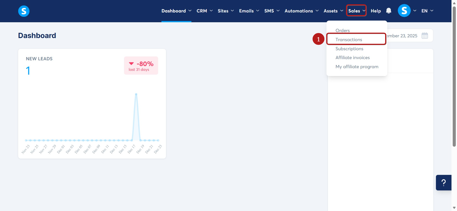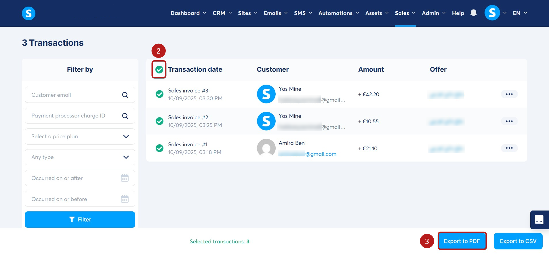 On the transactions page, you can either select all transactions (2) or manually select the transactions to export invoices for.