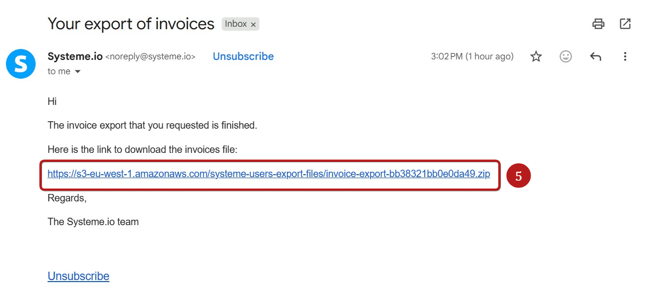 To download the invoices, go to the mailbox for the email address associated with your systeme.io account, open the email titled Your export of invoices, and click on the link to start the download (5).