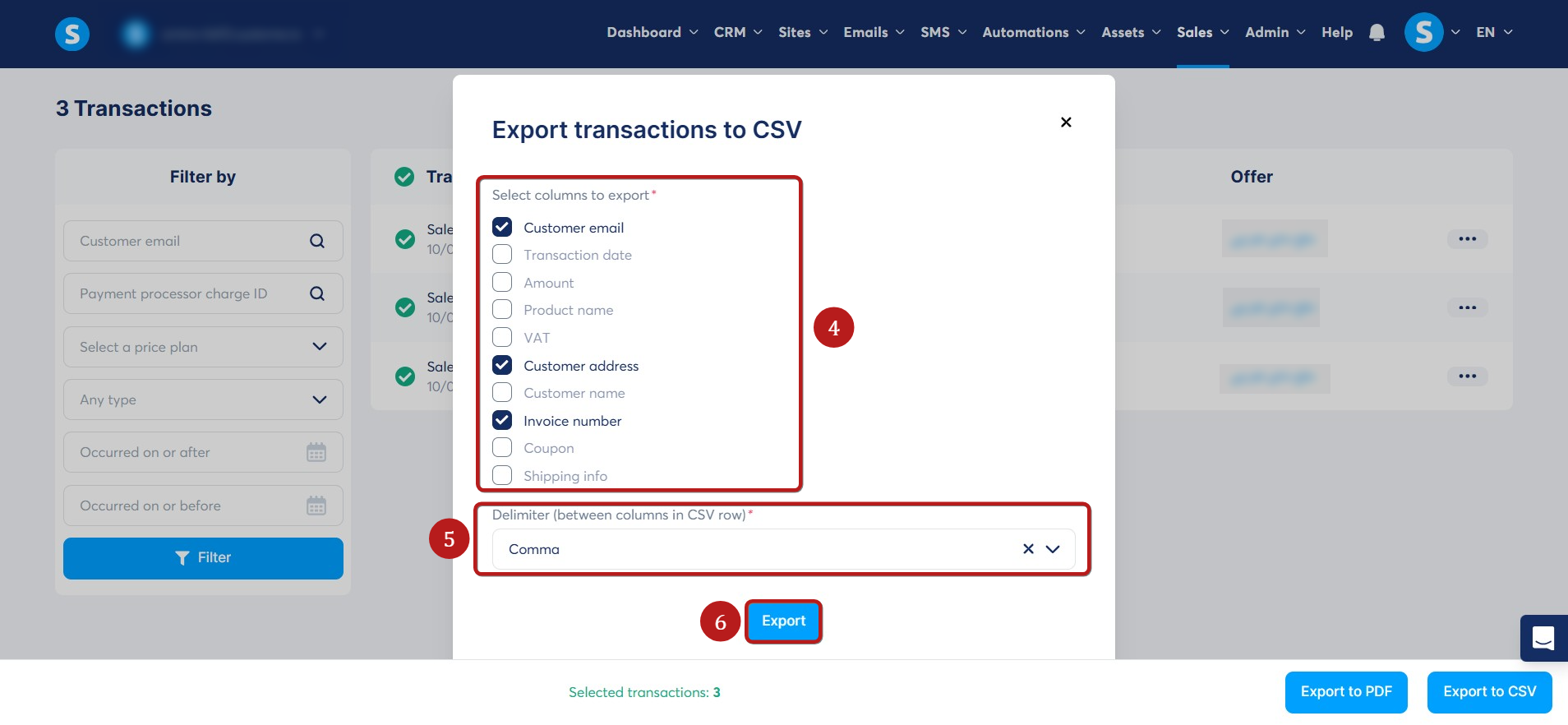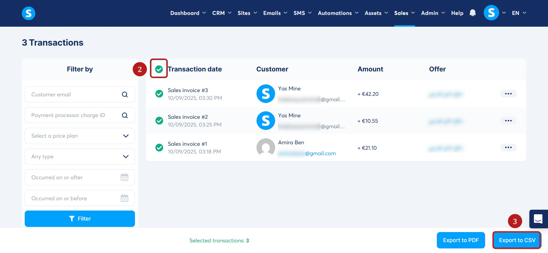 On the Transactions page, select the specific entries you wish to export, or select all (2), then click on Export to CSV (3).