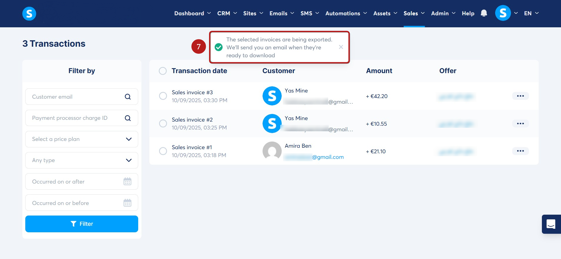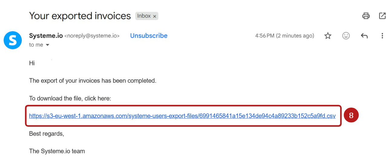To download the file, check the mailbox associated with your systeme.io account. The subject of the email you receive will be Your exported invoices.