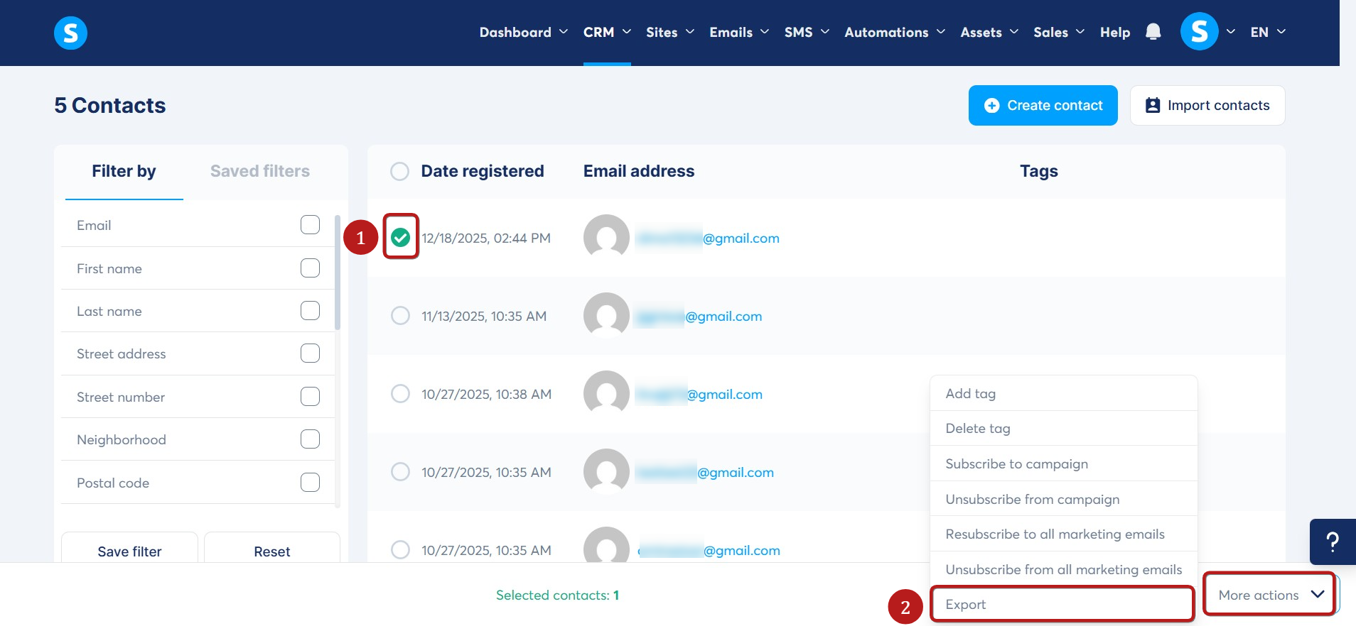 Go to your contacts dashboard and select the contacts you’d like to export (1). Click More actions in the bottom right corner, then select Export (2).