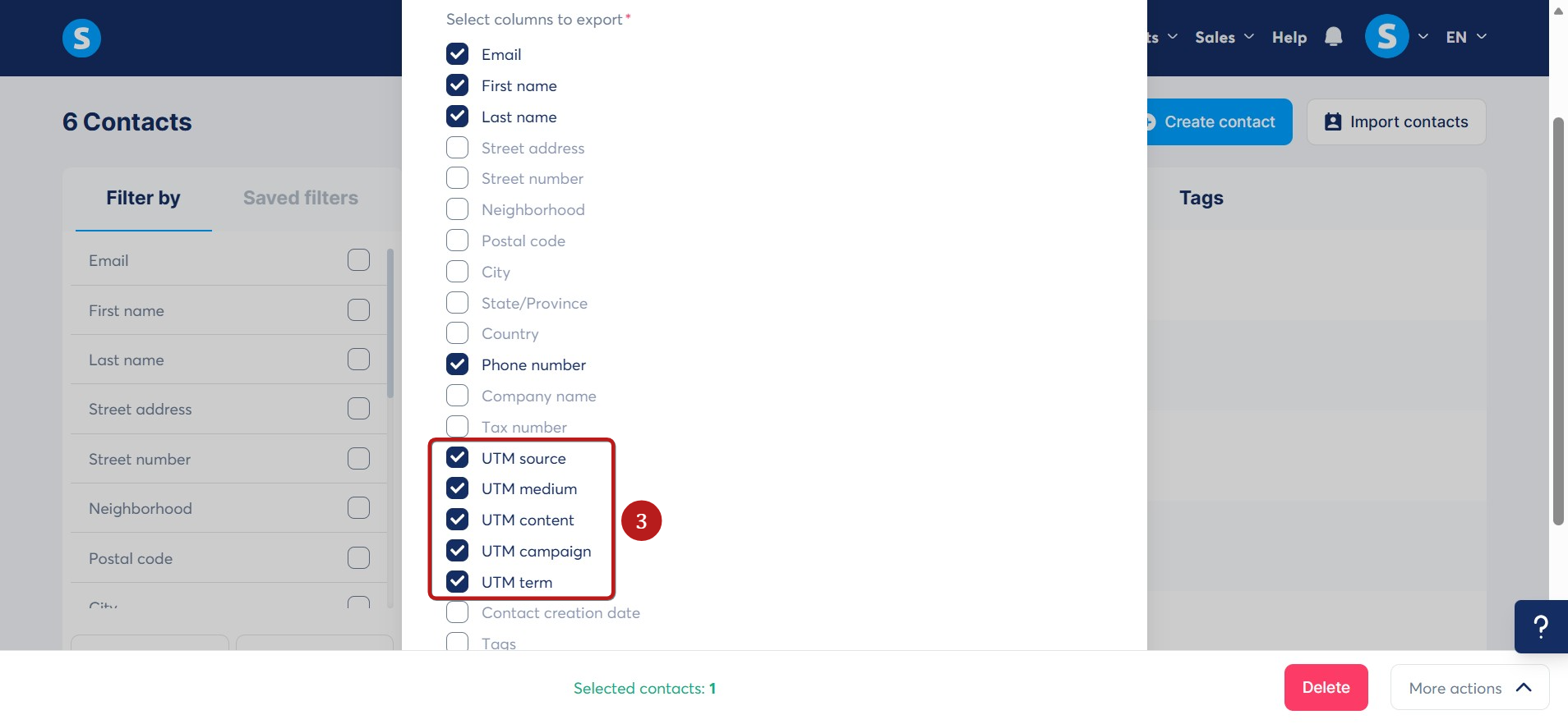 Select the UTM parameters to include when exporting the contacts (3).