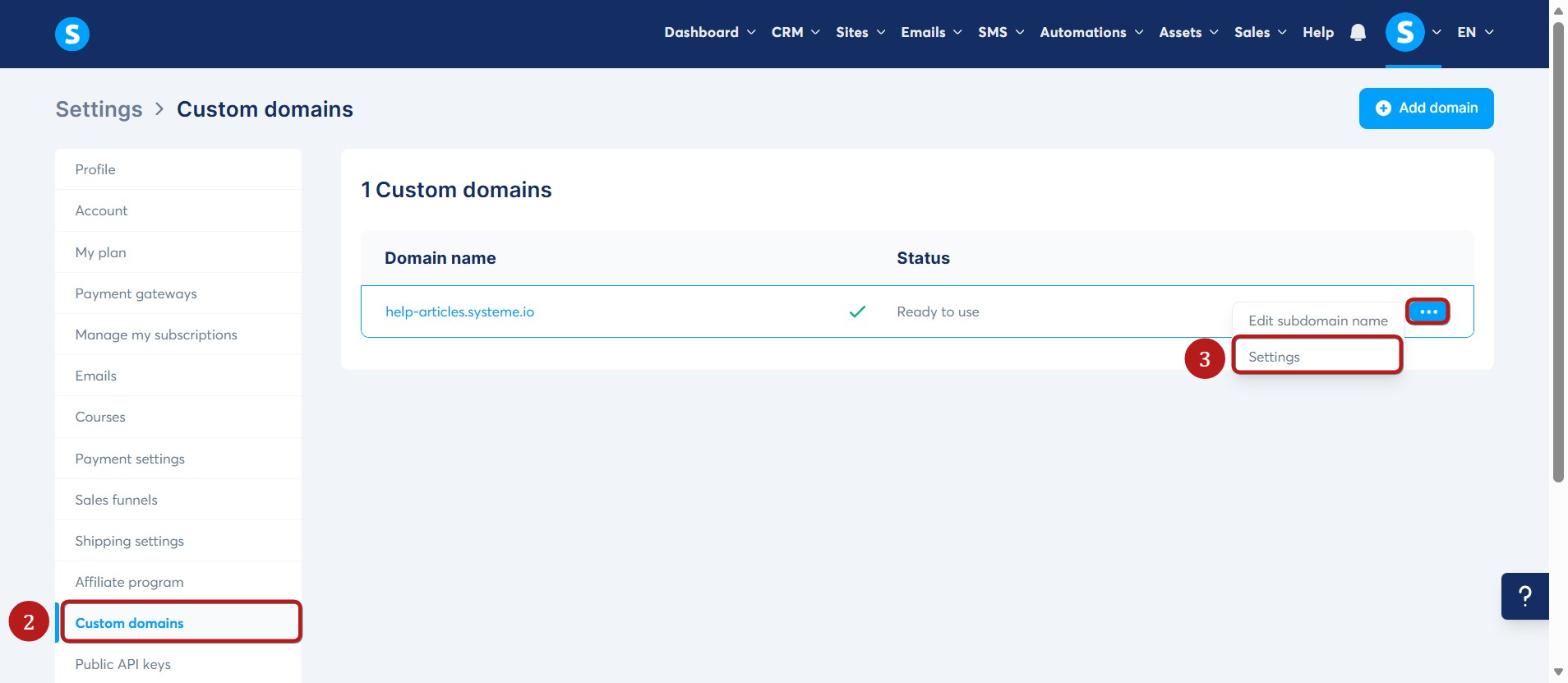 Click Custom domains in the left panel (2). Next, click the three dots (...) menu for your domain and select Settings (3).